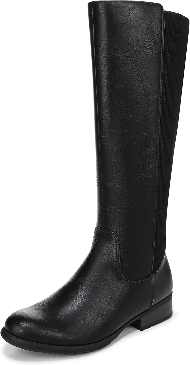 Get a comfortable, custom fit in these sleek tall boots with built-in stretch. Faux leather upper with a round toe, inside zipper, and stretch sweater panel at the back for maximum comfort and adjustability. Trusted Soft System® comfort technology for unmatched cushion, support, and flexibility in every pair. 14 3/8 inch boot height, 14 1/8 inch calf circumference. Note: Measurements based on size 6 boot. For each half size larger, shaft height increases by . 12 in, circumference by . 20 in. Just Right Height 1 1/4 inch heel.