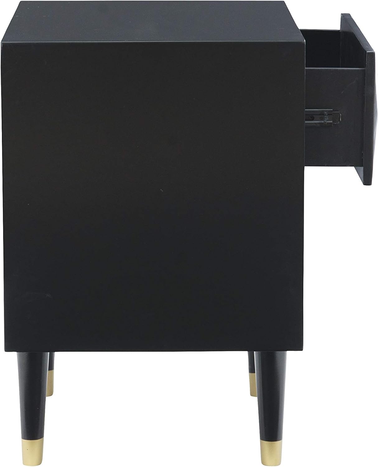 Make a bold statement in your bedroom or living area with this sculptural nightstand. A matte black finish highlights the faceted drawer fronts, whose smooth geometric design is complemented by gleaming gold-tone square pulls. Sleek tapered legs capped in matching gold further enhance the Art Deco appeal while ensuring sturdy support. Two spacious drawers measuring 22†W x 13.2†D x 5.25†H provide ample room for bedside essentials, from books and chargers to socks and personal items. With its blend of dramatic texture and refined accents, this piece makes for a chic addition in contemporary and transitional homes alike.