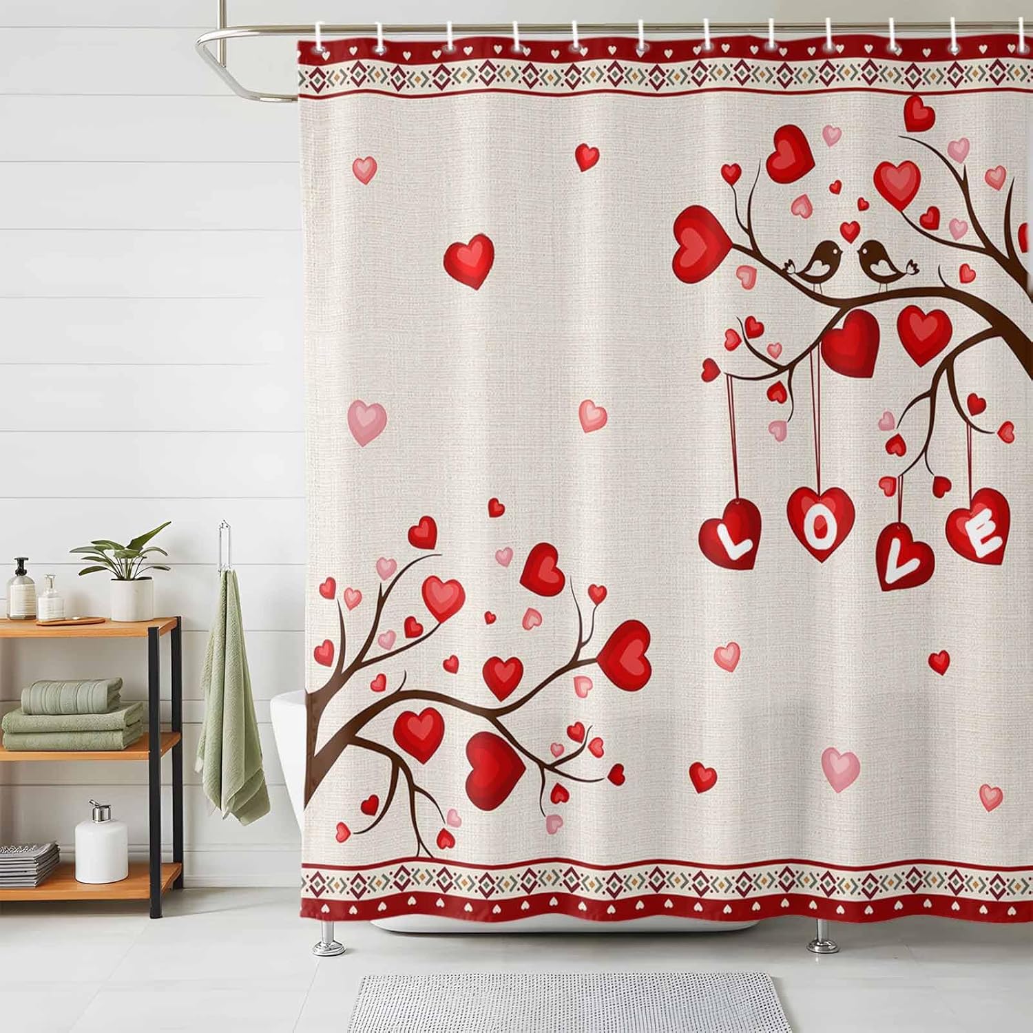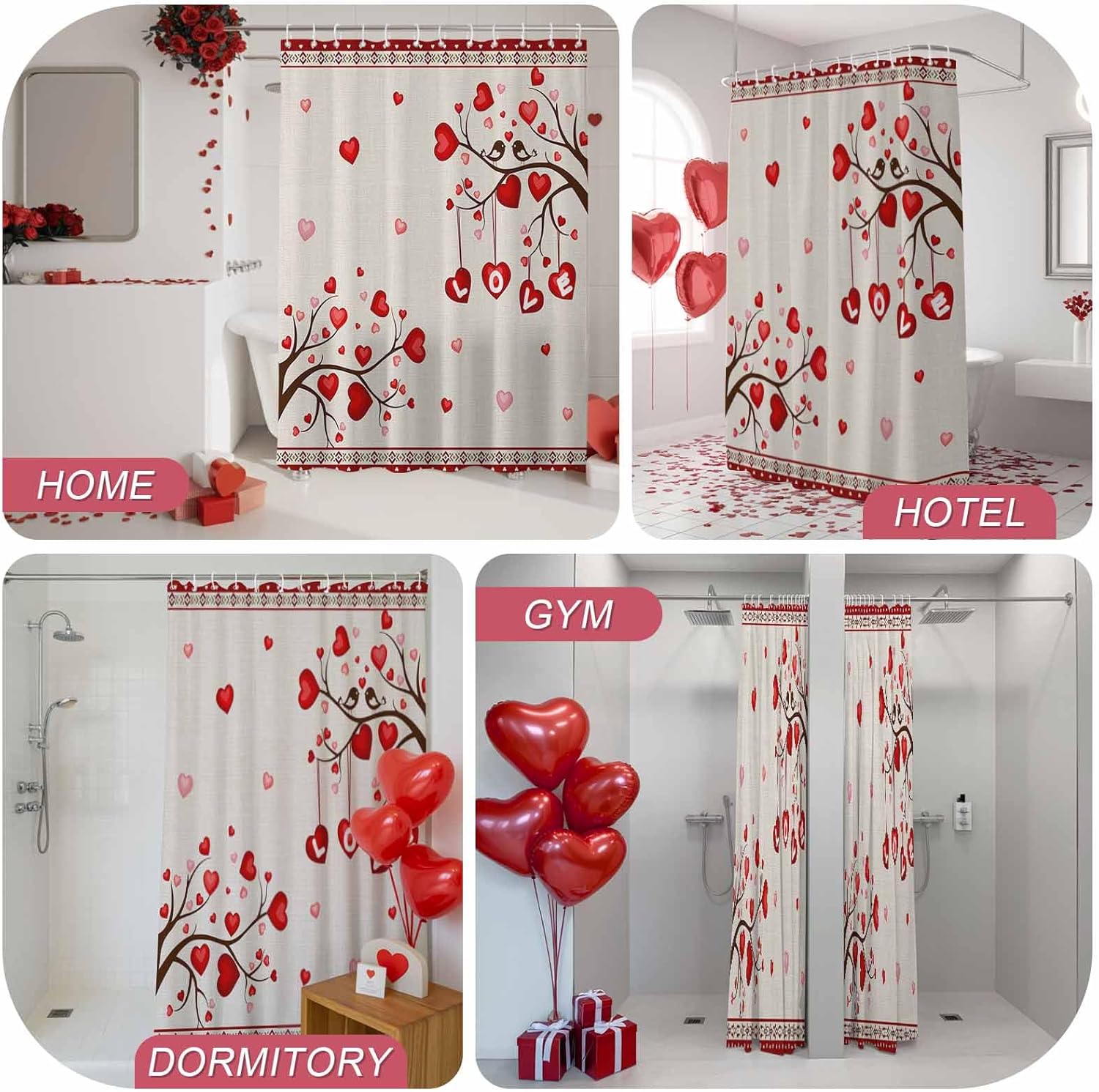 Waterproof Polyester Valentine's Day Shower Curtain for Bathroom DecorPackageOur shower curtain set includes 1 shower curtain and 9-12 plastic hooks, which are easy to install.Quality MaterialOur shower curtain was made from premium waterproof polyester, durable and washable. It can prevent the splashing of water from the bathtub during bathing.Easy Care:Machine washable.No need to worry about shrink and color fade. Bleach is not available.Perfect AdditionIt is a good choice to pick these shower curtains for your house for decoration, to create a chic shower atmosphere.Multi SizeWith a variety of sizes of shower curtain, you can choose the size that suits you according to the actual measurement.Size Dimension:36x72IN=91x183CM48x72IN=122x183CM54x78IN=137x198CM60x72IN=152x183CM66x72IN=168x183CM72x72IN=183x183CM72x78IN=183x198CM72x84IN=183x214CM72x96IN=183x244CMNOTE: Please allow some deviation due to manual measurement.