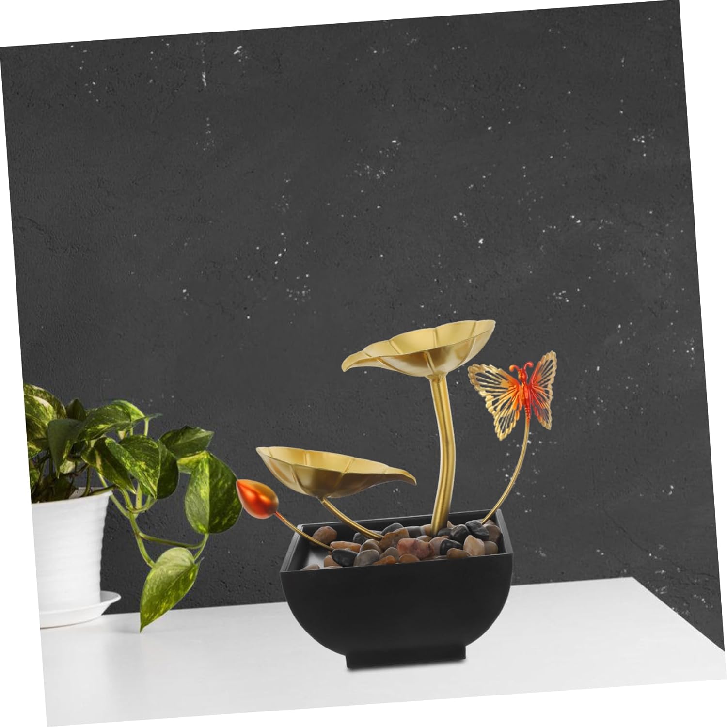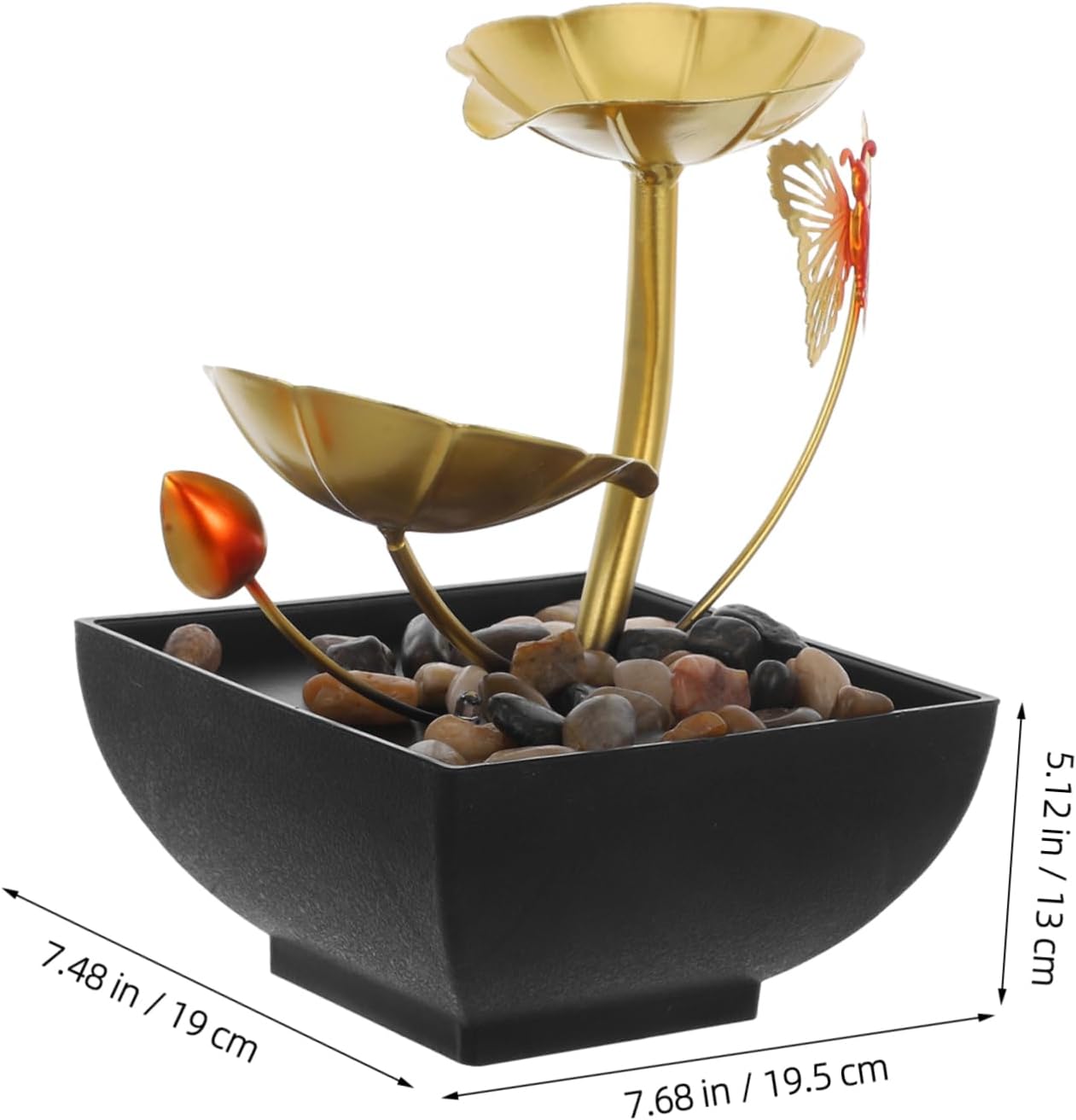 Package Include 1 fountain, 1 pump with USB cable, 1 stone Features -Material:ABS, stone, iron natural -Eye catching design: the golden lotus leaf and waterfall design of this fountain make it a beautiful addition to any indoor decor use -Air humidification: the mist from the fountain increases indoor humidity, improving air and -Sturdy construction: made with resin and iron, ensuring the fountain's durability use tabletop -Color:Golden tier -Versatile placement: suitable for various indoor settings such as offices, living rooms, and bedrooms, enhancing the ambiance leaf -Size:19.50X19.00X13.00cm/7.66X7.47X5.11in design -Great present idea: this relaxation fountain makes a thoughtful and unique present for friends, family, or anyone in need of a little relaxation and tranquility riverGoods Informationdesign This elegant leaf tabletop fountain is designed to bring a sense of tranquility to your home or office.fountain The realistic landscape decoration and natural river rocks create a harmonious and visually appealing display.relaxation The gentle flow of water over the lotus leaves provides a calming effect, making it a suitable addition to any indoor space