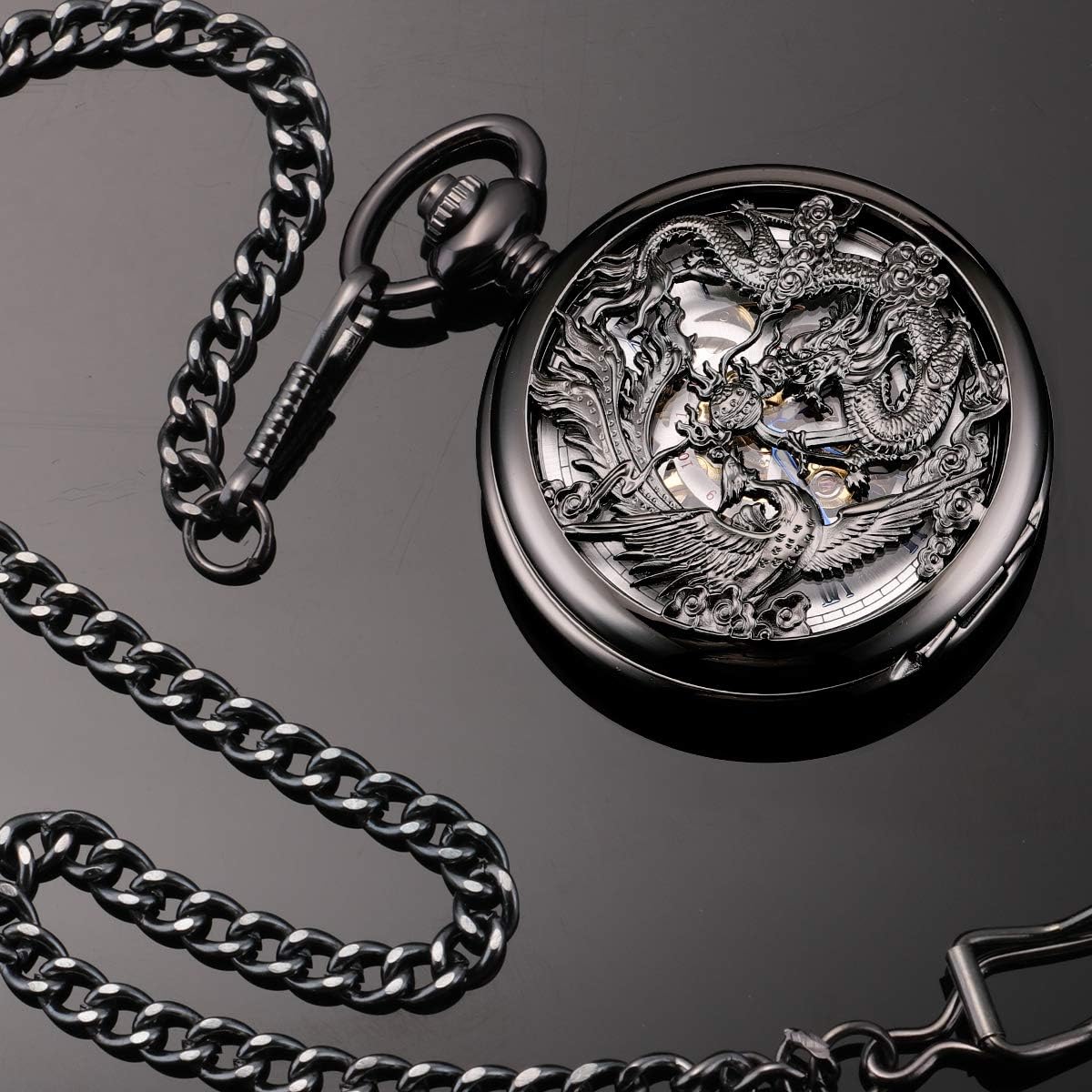 ManChDa Antique Mechanical Pocket Watches for Men Lucky Dragon Phoenix Pocket Watch with Chain Skeleton Dial Roman Numerals Gifts for Fathers Day