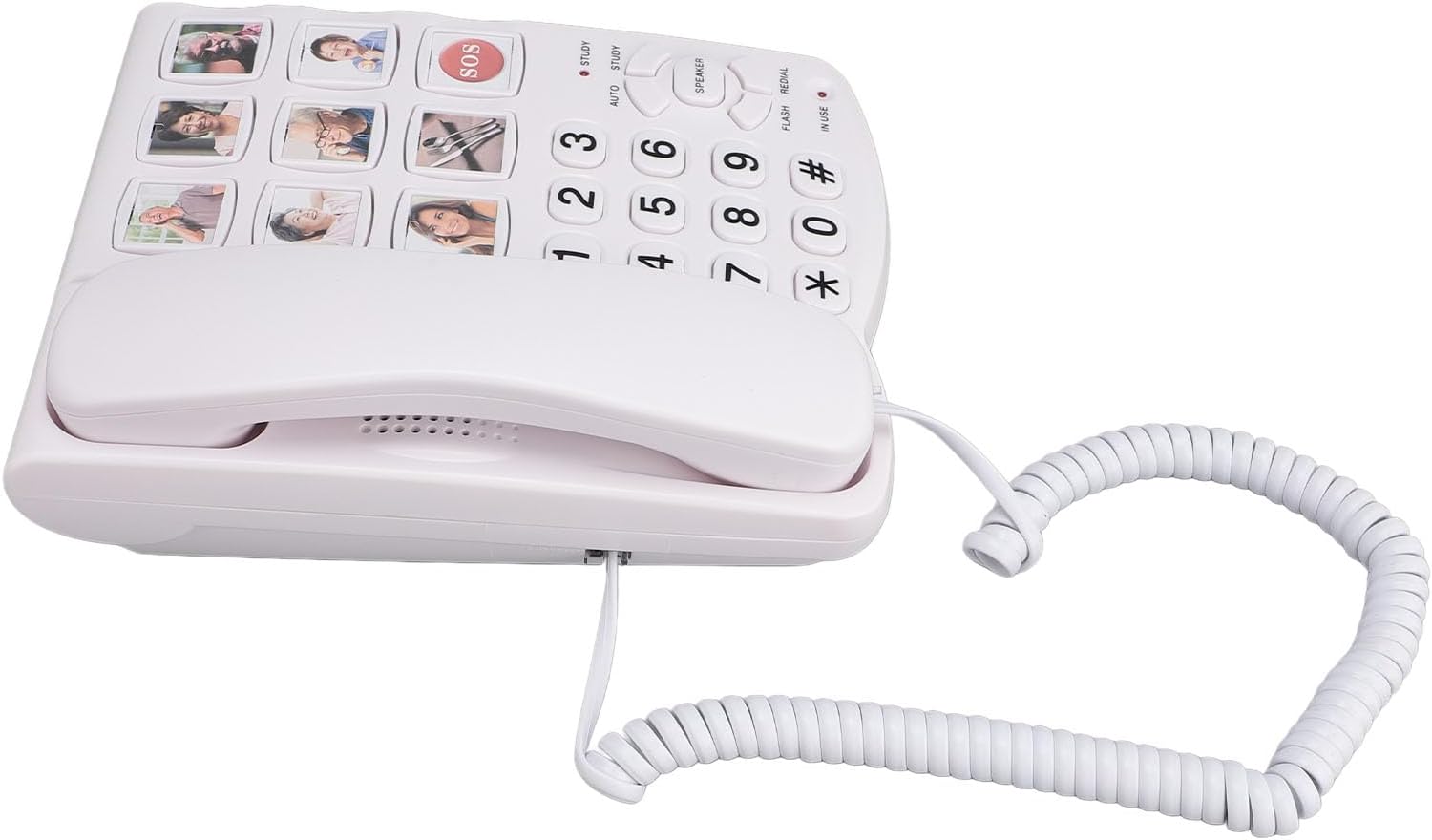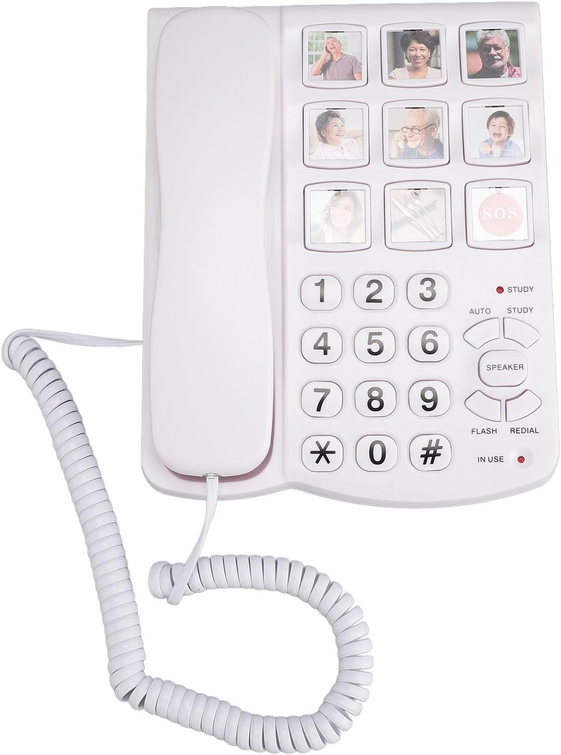 [Easy Emergency Access] Fixed SOS dialing and remote control ensure connection in case of emergencies. [User-Friendly Design] Large buttons facilitate quick calling, perfect for seniors and those with impairments. [Adjustable Sound] Customize ringer and handset volume up to 75 db for a clear calling experience. [Durable Build] Made from ABS, this corded phone requires no batteries and is ideal for long-term use. [Picture Buttons] Includes 9 customizable photo buttons for easy dialing, simplifying communication for loved ones. Item Type: Big Phone Material: ABS Color: White Remote Control Battery: Built in 2 x 75mAh CR2016 Cell Batteries (included) Function: 1. 8 groups of single key affection keys, picture one touch dialing 2. 3 groups of SOS key affection , picture one touch dialing (three groups of numbers can be manually cycled out) 3. Remote control SOS dialing function (three groups of numbers can be manually cycled out) 4. 10 sets of two key affection keys 5. One touch SOS dialing (user defined) 6. Indicator light function 7. Flash off function (FLASH) 8. Redial function: (REDIAL) 9. Handle handset volume three adjustable (large, medium, small three) (HI, MED, LO) 10. Ringer volume large, small, off three adjustable (large, small, off three) (HI, LO, OFF) Scope of application: for the family, for the elderly with impaired and hearing 1 x Landline Telephone 1 x Handset 1 x Handset Cord 1 x US Phone Cord 1 x UK Phone Cord 1 x Remote Control 1 x Lanyard 1 x Instruction Manual It is normal for the number keys not to emit a signal sound when storing a phone number. This is the way the phone number is stored, not the behavior of the number keys not working.