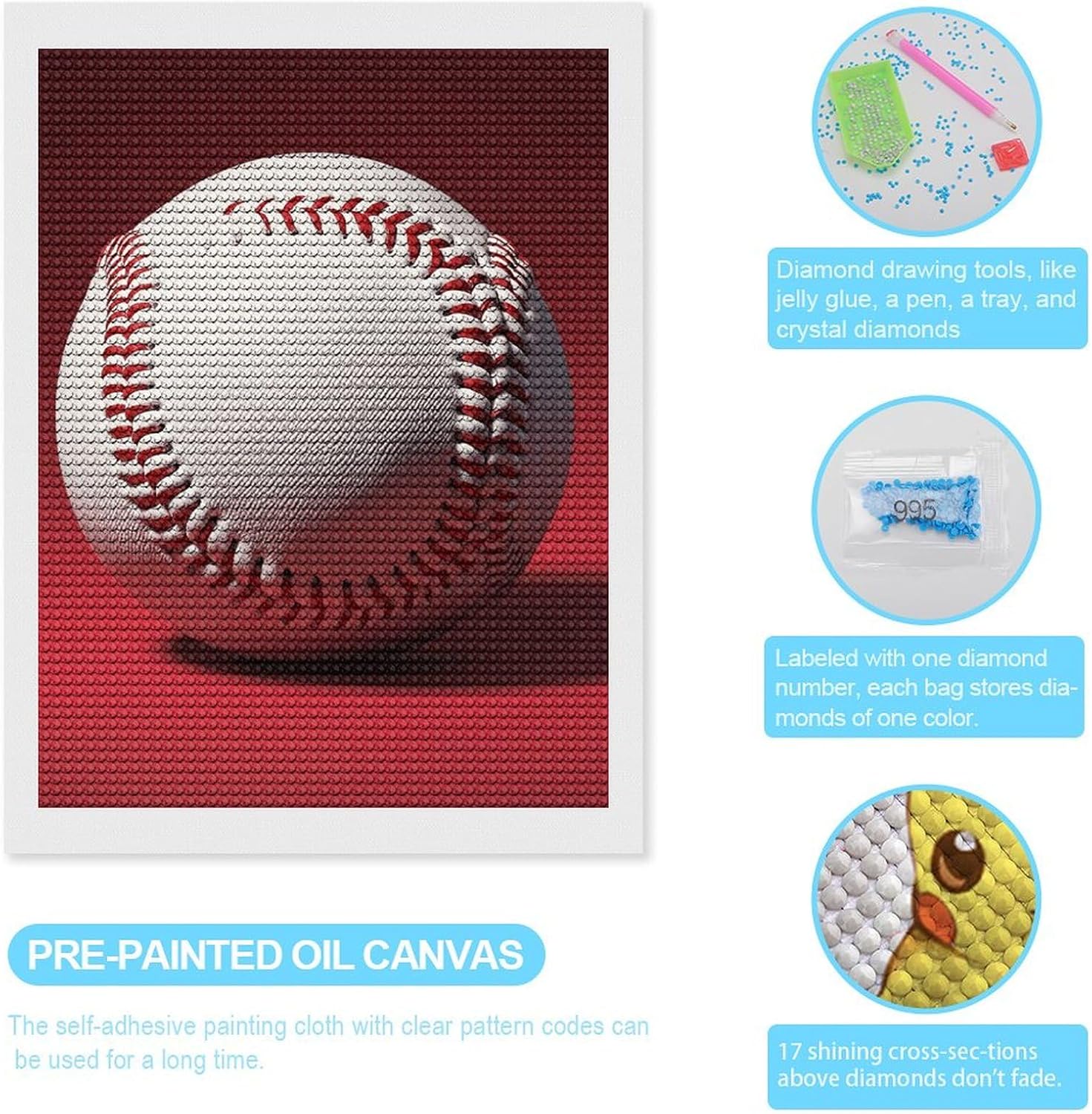 DIY full drill paint with diamond round 5D gem art kits for adult round gem art paint by diamond home wall decor wall art decor What is Diamond Art? Like a combination of cross-stitch and paint-by-numbers, diamond painting is the new creative hobby that's taking the crafting world by storm. About our Sport Baseball full drill diamond art kits: Accessories structure: This Gem Art Painting Kits is a canvas model without a frame, including 1 spot drilling tools + 1 drilling disc + 1 drilling mud Material: Chemical fiber cloth + Diamond Material Resin (acrylic) 3 Sizes: 8"×12" 12"×16" 16"×20" Color: As shown in the figure Making diamond art paintings is an excellent way to reduce stress. By pasting each diamond onto the canvas, you can enhance your focus and patience, enjoy the fun of creation, and gain a great sense of accomplishment and satisfaction in completing your work. How should you carry out this gem painting kit work? As a first step, you need to find a spacious and clean workbench to ensure that it can accommodate all the tools you need to complete the gem art painting. Step two, take out your diamond painting kit and lay the canvas flat on your workbench. Step three, select a color or symbol of diamond and pour it into the tray. Step four, place the diamonds in the tray in the corresponding squares in order according to the markings on the canvas. Finally, you simply repeat the above steps until you have completed this sparkling diamond art painting! Click Add to Cart to take these diamond picture home! If you are at all unsatisfied with your product, please contact us. We will actively solve your questions! Thank you again for visiting our store. Wish you a happy shopping!