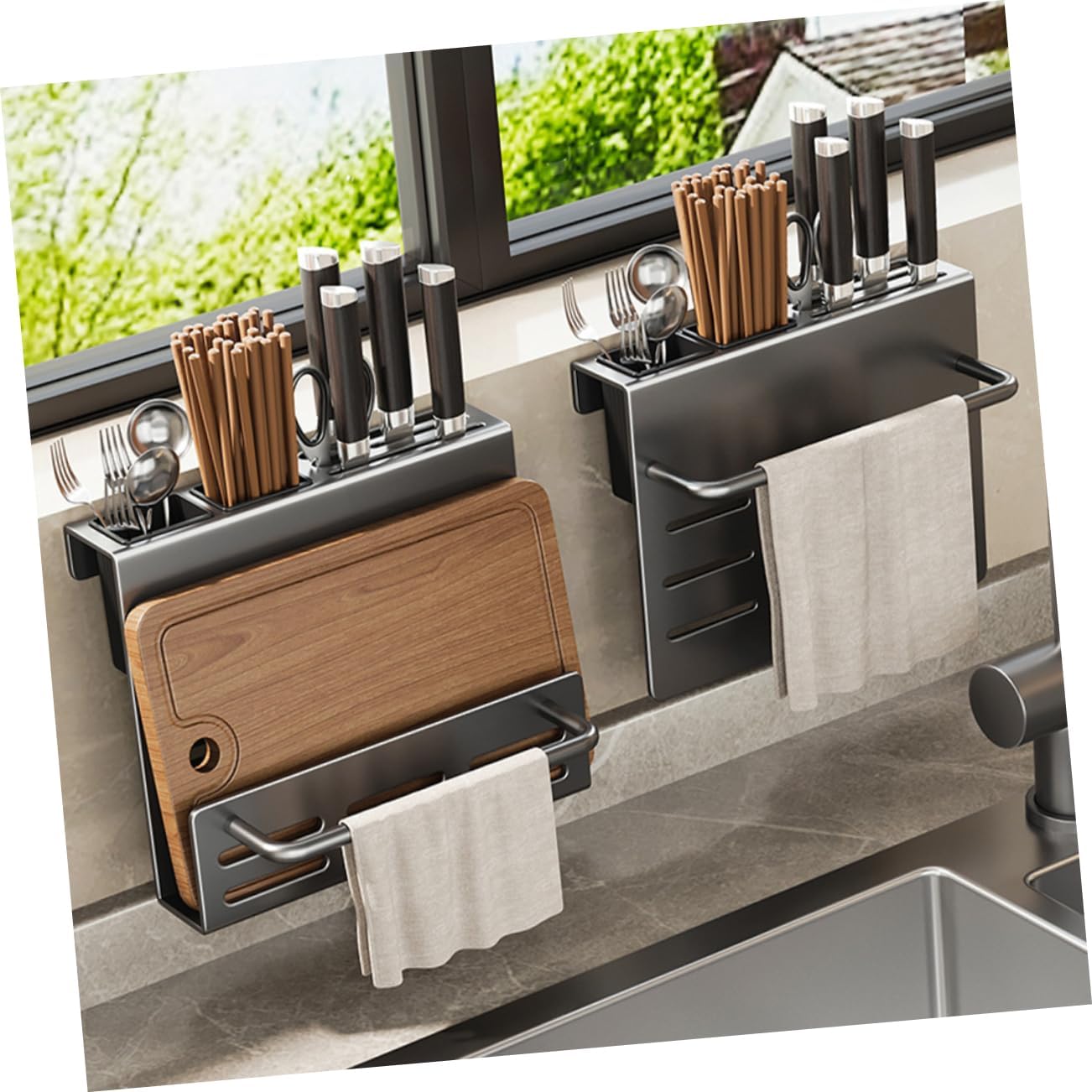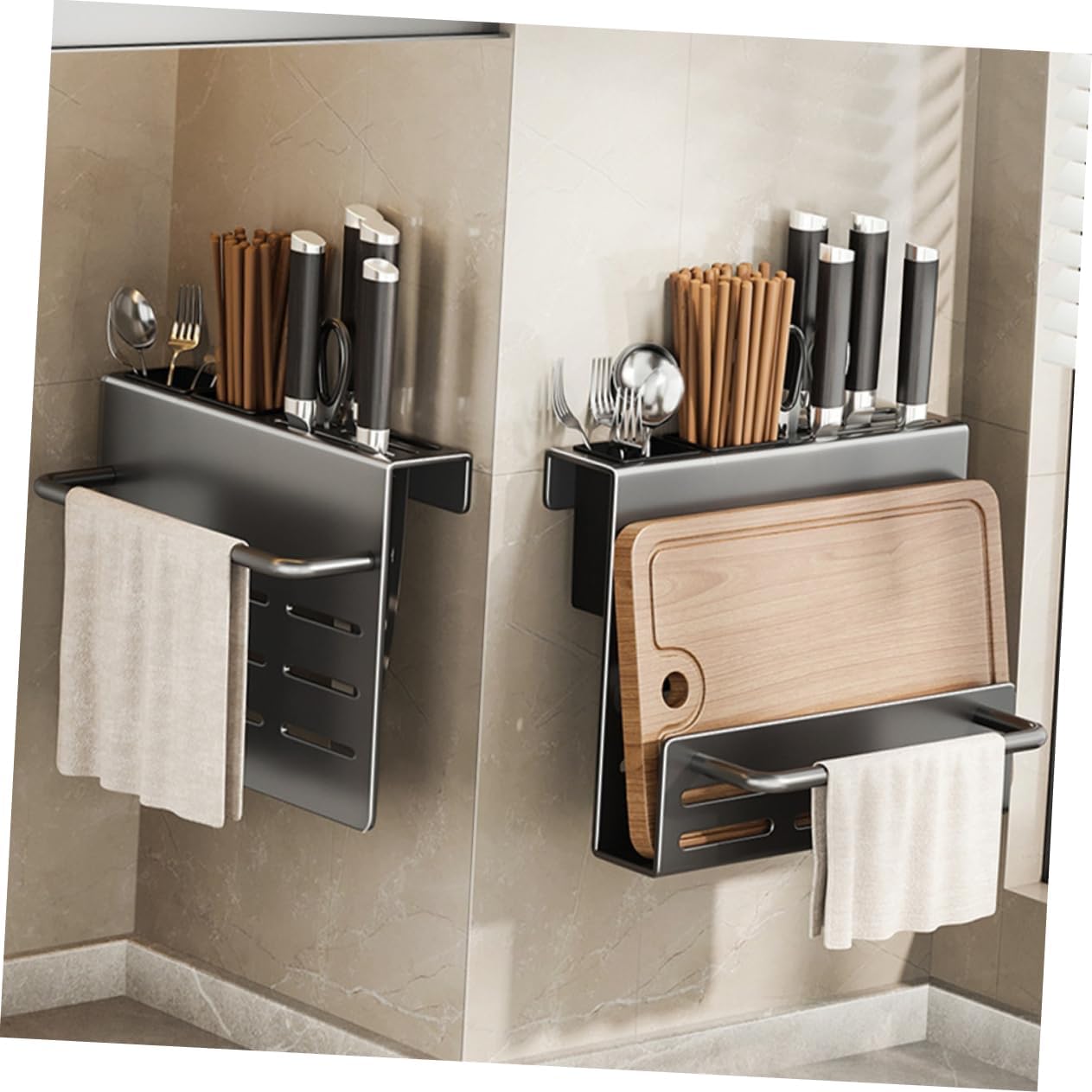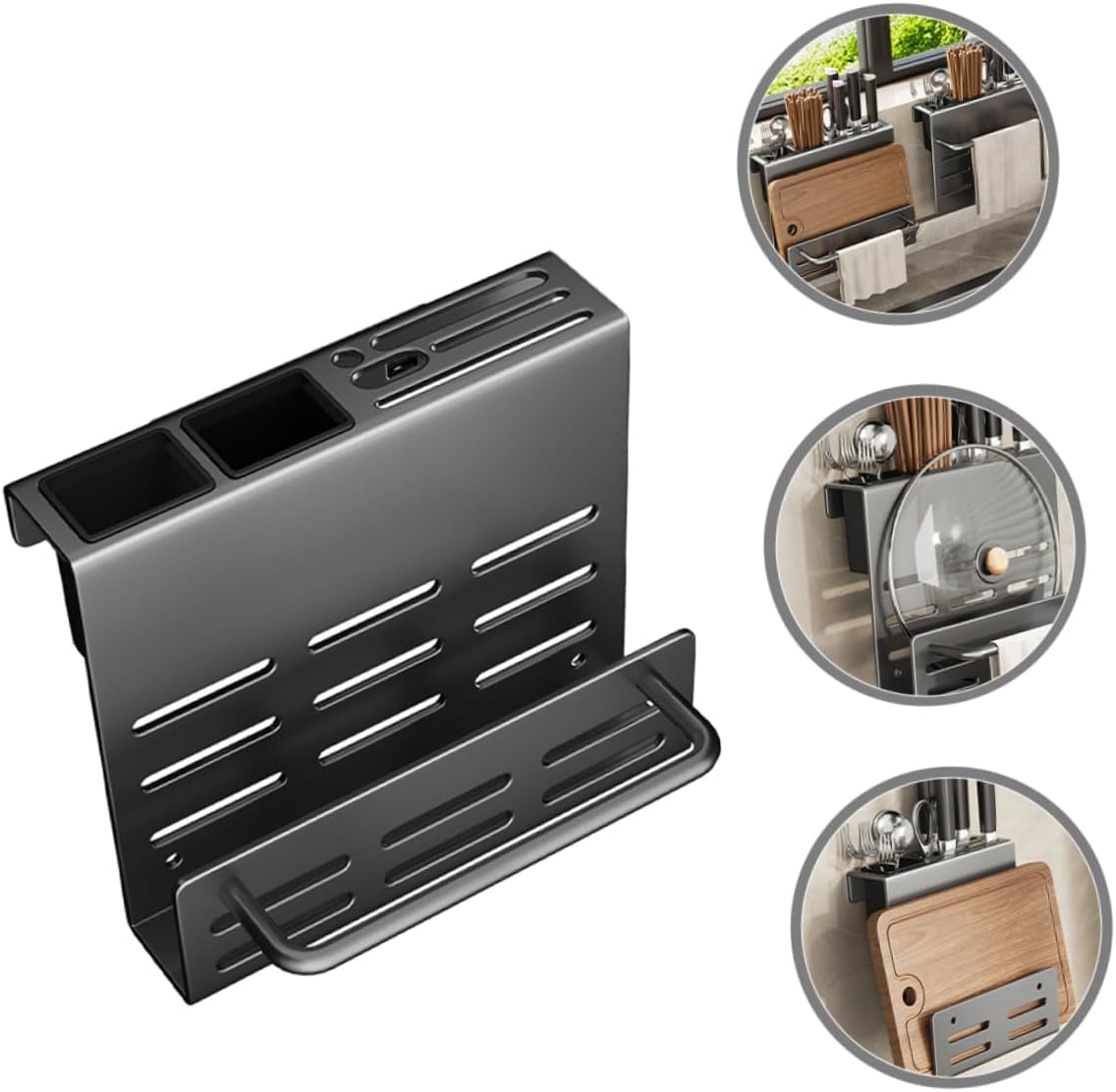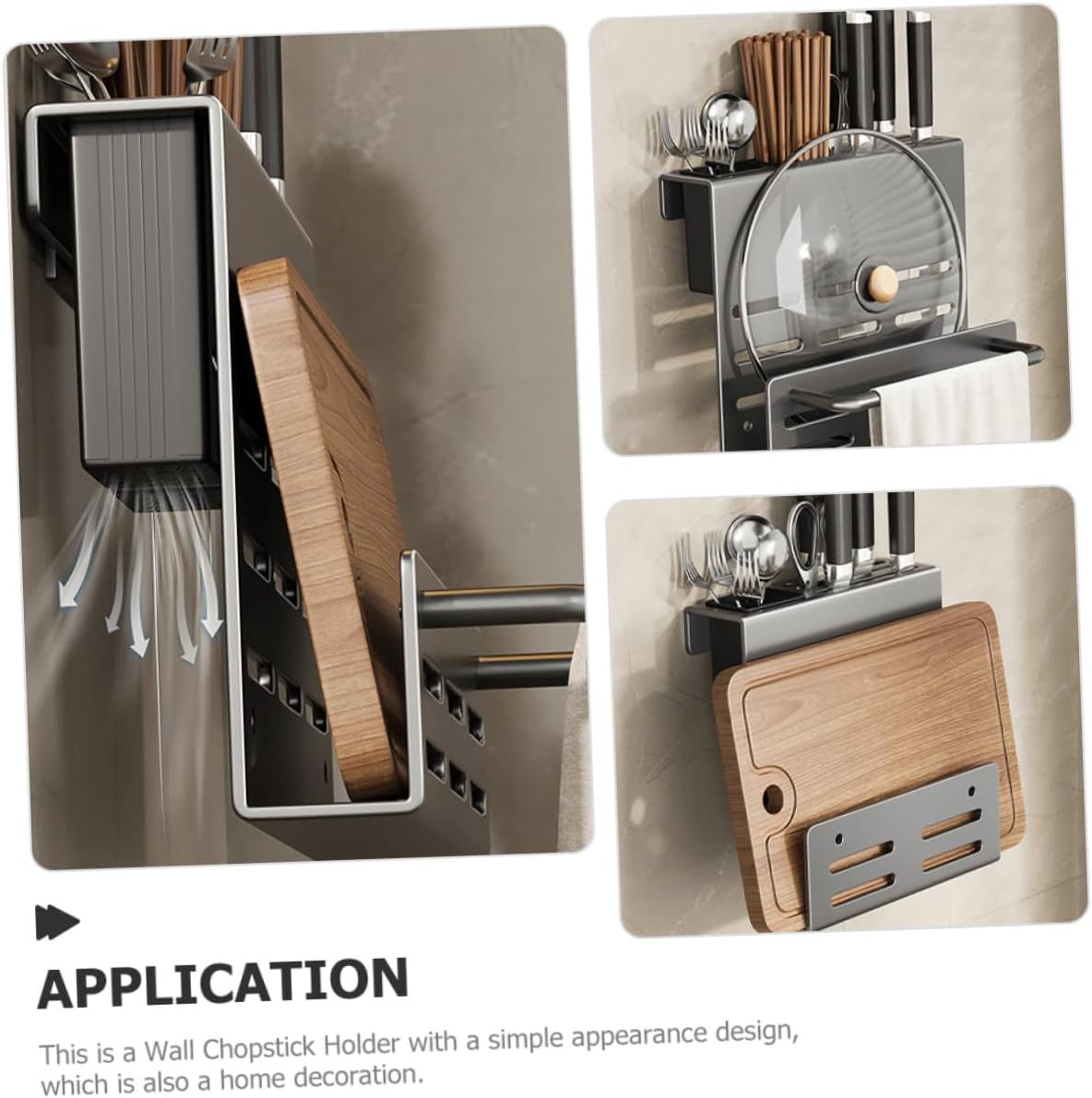 Package Include 1 x tableware rack 1 x hang buckle 2 x spoon fork cups 1 x glue 2 x auxiliary sticker 2 x screws 2 x anchor bolts Characteristics -Material:Carbon steel Daily Use Cutlery Holder -Size:27.50X21.00X15.00cm/10.81X8.25X5.89in Utensil Holder For Storage -Color:Grey Sturdy Utensil Holder -Also can be a decoration for your kitchen, can increase a kind of special atmosphere at your kitchen Utensil Accessory. - and simple color, with draining hole design, reliable material, beautiful and Chopping Board Holder. -Suitable for storing and keeping kitchenware utensils accessible and tidy, and can save countertop space Chopsticks Case. -Manufactured with stable material, and for long term use. With beautiful and appearance will ensure its popularity and practicability Kitchen Spoon Container. -This kitchen wall organizer doesn't take up too much space, and this cutlery holder has storage capacity Board Organizer.Goods DescriptionUtensil Supply This kitchen Chopstick Holder, which is made of stable material for and use.Wall Kitchen Utensil Holder With simple appearance, it will ensure its popularity and practicability.Chopstick Holders Suitable for storage of spoons and other cutlery.Chopstick Draining Holder Convenient storage design, and smooth surface, the bottom with hole to drain water, beautiful and