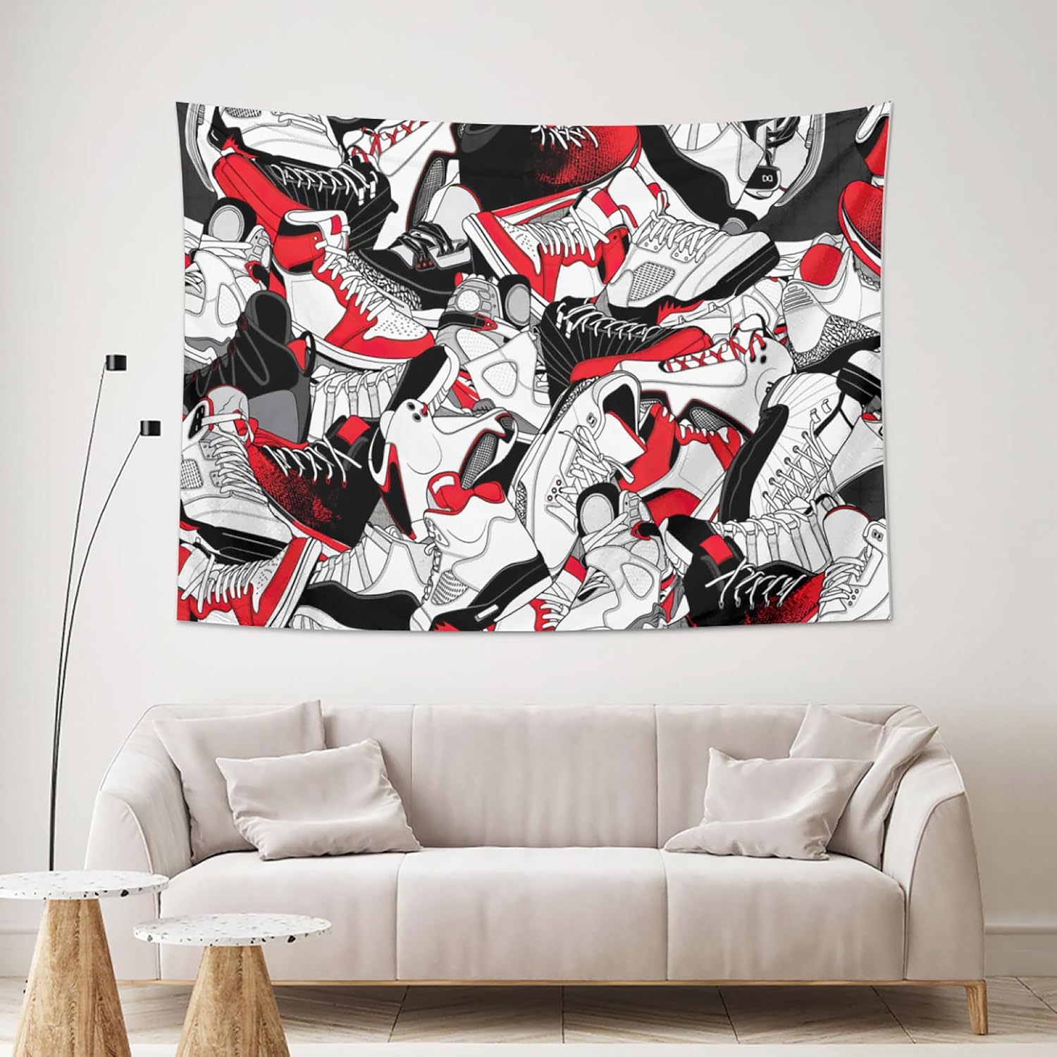 Transform any room into a basketball shoe lover's paradise with this basketball sneaker ball themed decor set! This collections are the basketball tapestry wall hanging, featuring a vintage-inspired design. Made from polyester, this sneaker ball backdrop tapestry is lightweight, and easy to hang with the included hardware. This sports basketball tapestry wall art includes backdrops featuring sneaker balls and sneaker heads, suitable for creating a photo booth or adding to your party decorations. These sneaker photo backdrops are designed to be both eye-catching. And that's not all! This sneaker backdrops for photoshoot includes a sport shoes poster that showcases some of the most basketball footwear of all time. Hang sneaker blanket up in your bedroom or office to show off your love of the basketball game in style. Whether you're throwing an basketball-themed birthday celebration or just looking to add some sporty style to your space, this basketball tapestry, sneaker ball decorations, and sneaker head backdrops set has everything you need to take your decor to the next level.