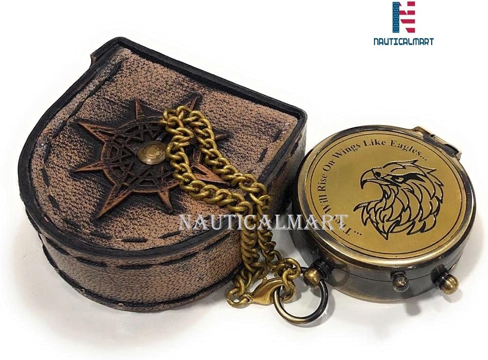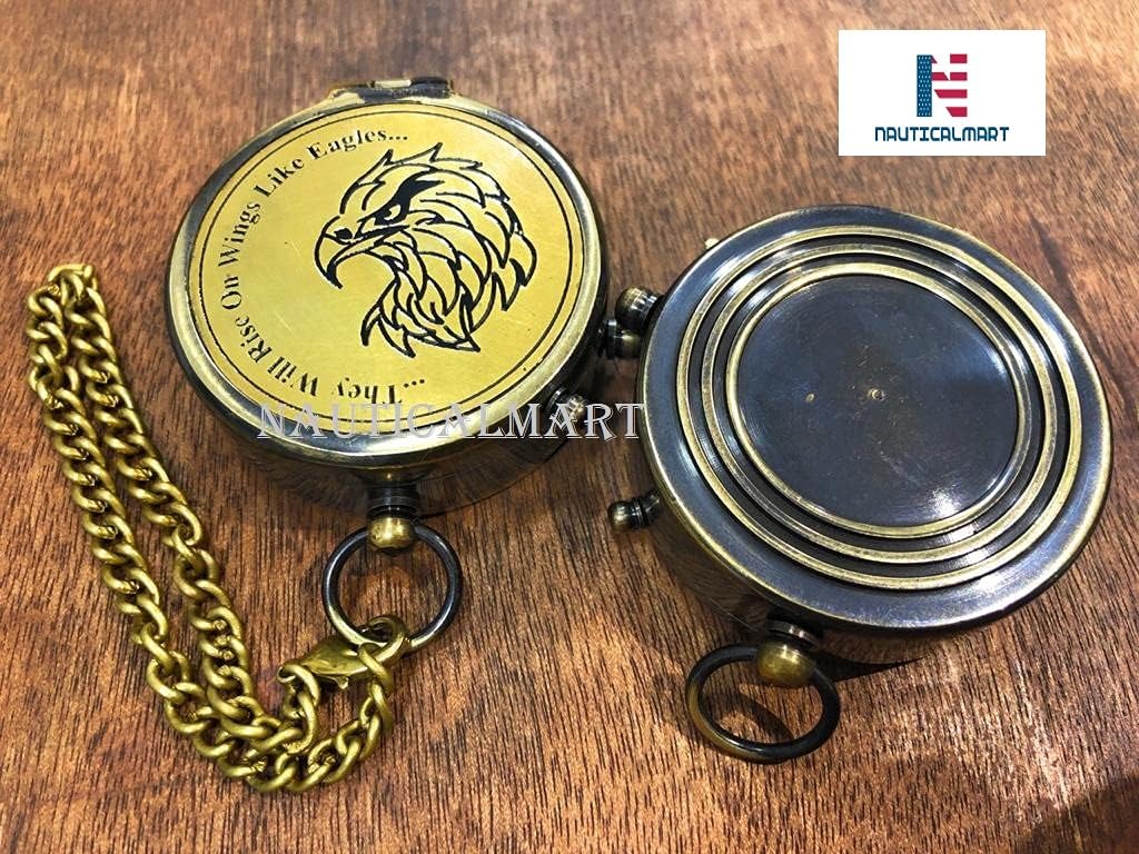 Solid Brass Compass with Eagle and "They will rise on wings like eagles" inscription engraved on top of Lid and Inner side of Lid has engraved inscription "But those who hope in the Lord will renew their strength. They will soar on wings like eagles; they will run and not grow weary, they will walk and not be faint." Isaiah 40:31. The eagle has a connection to many symbolic concepts. The eagle is a symbol of freedom, power, and courage to look ahead. Its symbolism carries with it the importance of honesty and truth. The eagle is also symbolic of our connection to God because it flies higher than any other bird. De Cube solid brass compass is unique and perfect gift for any occasion, graduation day