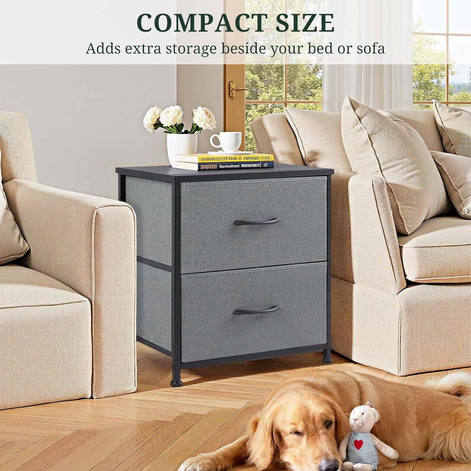 | Key Product Features | 【2-Drawer Nightstand with Storage】 Features 2 removable fabric drawers and a durable wooden top, providing ample space for nighttime essentials, books, electronics, or personal items. Perfect compact dresser for bedrooms, dorms, and apartments., 【Compact & Stylish Size】 Measuring 11.8" D x 18" W x 20" H, this lightweight nightstand fits perfectly in small spaces. Its modern wood-and-fabric design complements any home décor style, from modern to farmhouse., 【Multi-Purpose End Table】 Can be used as a bedside table, small dresser, small storage organizer, or sofa side table. Ideal for bedrooms, living rooms, offices, entryways, or children’s rooms., 【Quick & Easy Assembly】 Comes with all tools, accessories, and detailed instructions. Takes only about 15 minutes to set up, making it renter-friendly and convenient for small spaces or first apartments., 【Sturdy & Stable Design】 Built with a strong steel frame and water-resistant wooden top for long-lasting use. Easy-pull plastic handles make opening smooth, while 4 adjustable feet protect floors and maintain balance on uneven surfaces. |