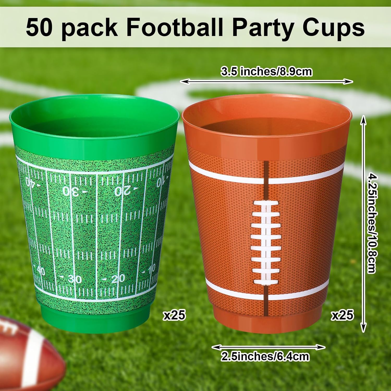 Features: Nice Gift Choice: These football theme cups set is a nice gift choice, you can give these cups as gifts to your friends or neighbors, which can make them more happy when enjoying the football party. Reusable plastic cups: These football plastic drinking cups are easy to clean and store, when the party is over, wash, dry and store in a stack in a cupboard or utility room so they will come in handy at your next party. Specifications: Material: plastic Color: as pictures shown Size: 4.25 x 3.5 x 2.52 inch/ 10.8 x 8.9 x 6.4 cm Package includes: 50 Pieces of 16oz football cups Notices: Don't put in the dishwasher to wash Manual measurement, please allow slight errors on size. The color may exist a slight difference due to different screen displays