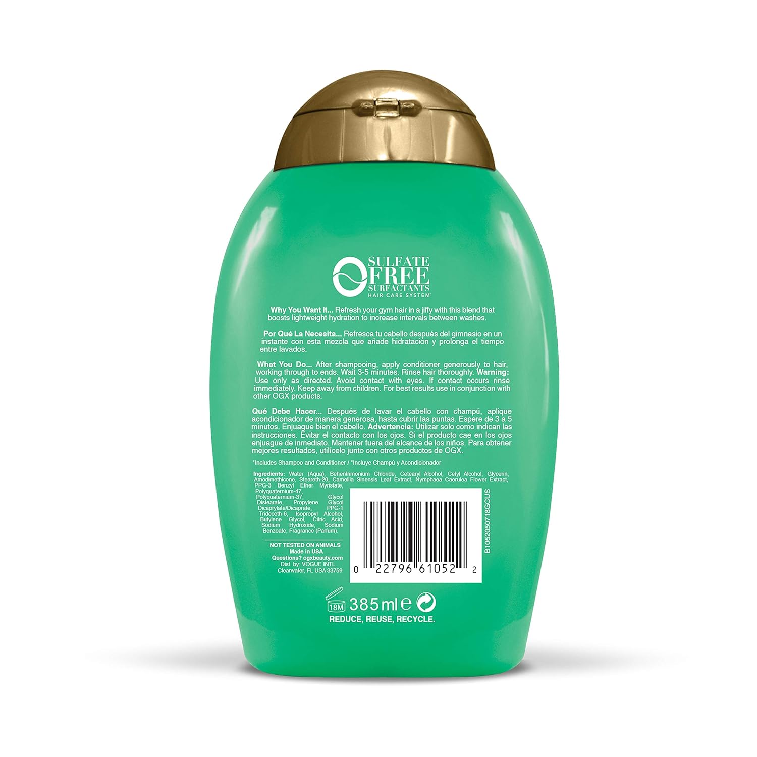 From spinderella to namastayin' in bed, help recover strands with our fitness-inspired Green Tea Fitness Conditioner. Infused with rich antioxidant green tea and refreshing lotus, this active fitness conditioner will help keep your hair feeling, looking, and smelling fresh while adding a healthy-looking shine, no sweat! Refresh and energize tresses with ingredients that can help increase wash intervals all while adding lasting moisture. After shampooing, apply Active Beauty Green Tea Fitness conditioner generously to hair, working through to ends. Wait 3-5 minutes and rinse hair thoroughly. For hair and body that's always in motion OGX Active Beauty Green Tea Fitness collection!