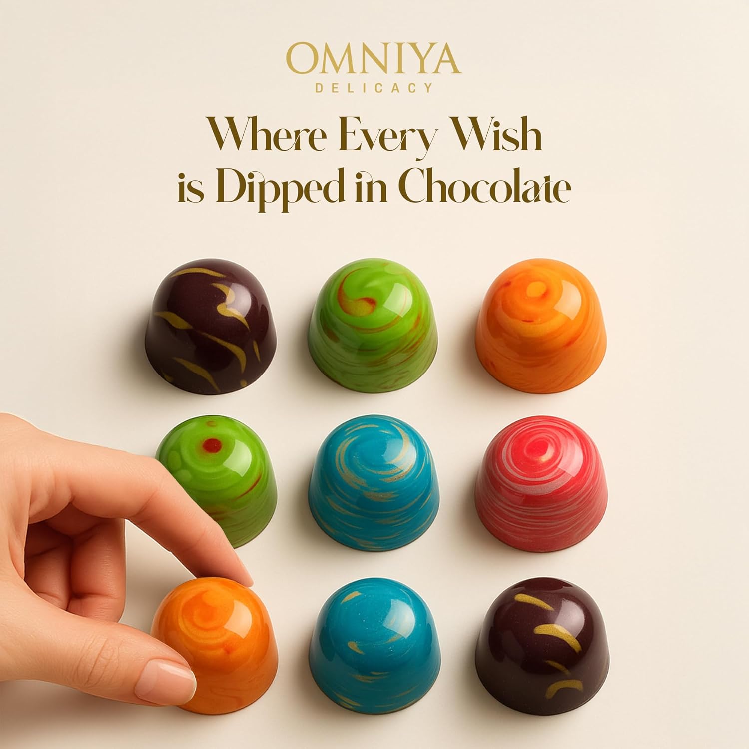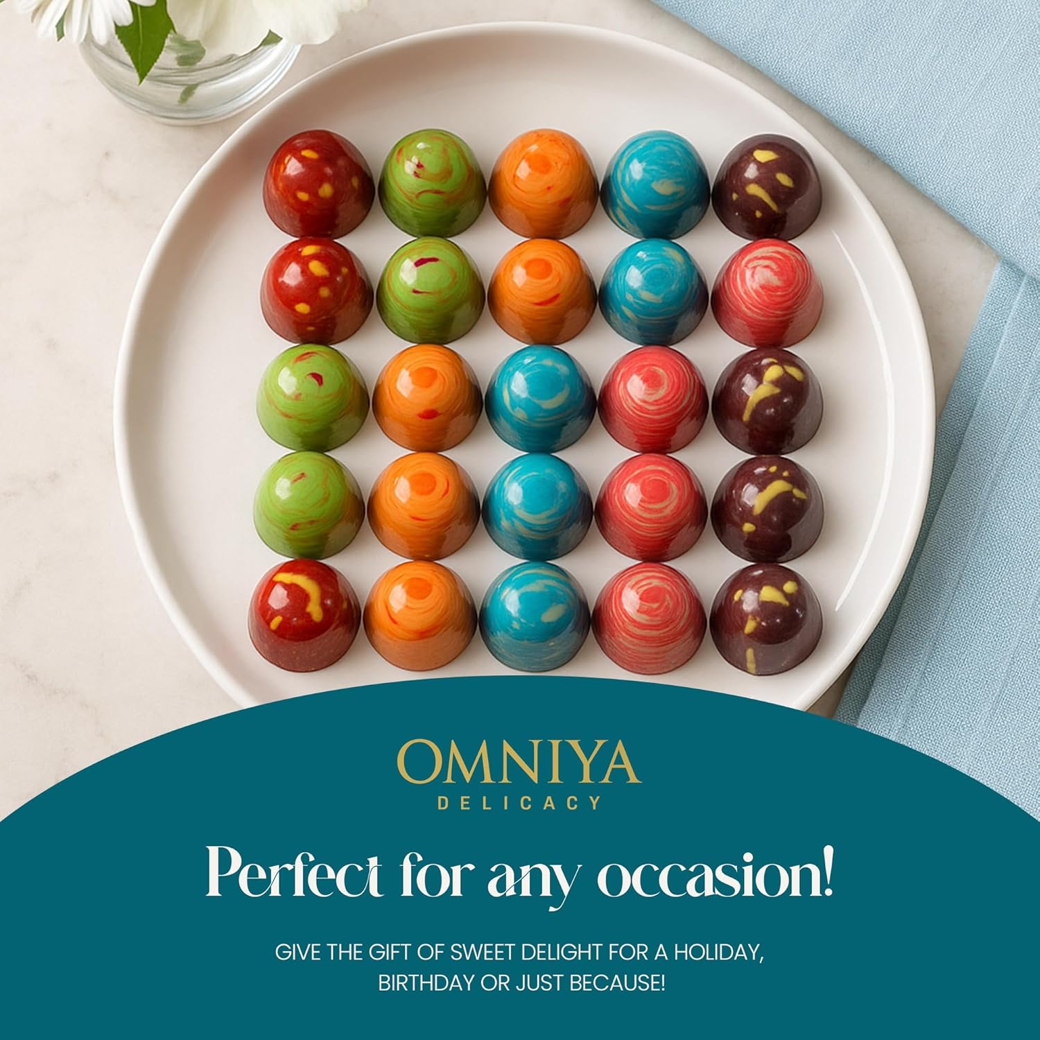 | Flavor | Blue Crème Hazelnut Biscuit, Green Crème Pistachio, Fuchsia Cheesecake, Burgundy Crème Lemon with Feuilletine, Bronze Crème Coffee with Caramel, Purple Crème Nutella with Oreo |