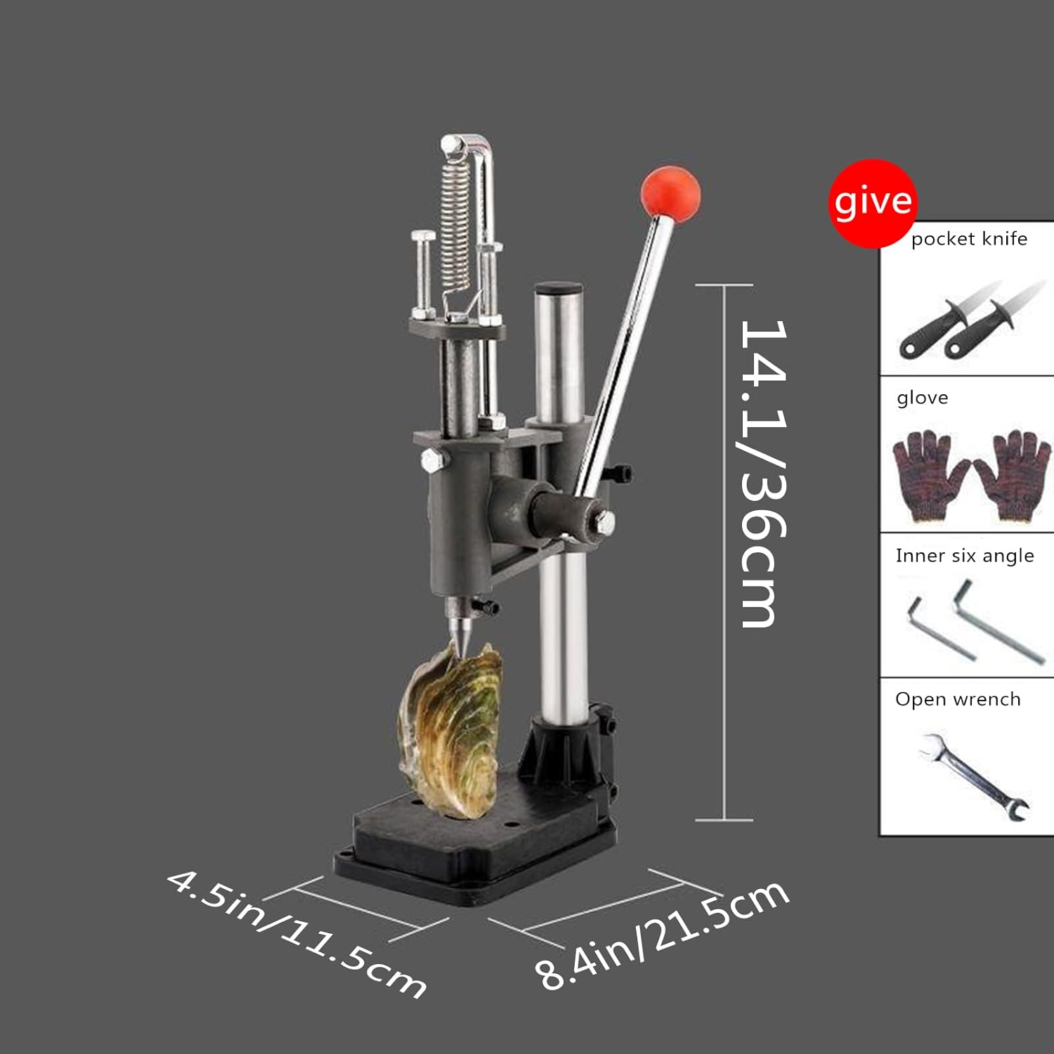 Kitchen Tools Oysters Opener Tool, Thick Metal Base,Hand Press Driller Opener, Easy Use Manual Oysters Hole Opening Machine for Open Oysters, Scallops, Abalone, ShellfishUpper grinding core made of cast iron materialnot of imposing stature but strong and capableAccurate flat design of the workbench,with more precise verticality to the columns, allowing for higher precision in machining parts1. Punch needle of this Oyster Shucker use high hardness material, 304 stainless steel. Faster stamping, save working time.2. Electroplated alloy rod. Oyster Shucking Machine is easy to operate and it has the anti skid design of red ball at the end of handle.3. Cast iron base + 304 base plate. Strong power and stable performance. Oyster Opener is equipped with cast iron base, so that it will be more stable and efficient.4. High performance spring. Use no deformation to ensure springback strength.5. Scope of application: oysters, mussels, scallops, abalone and other shellfish.Material: IronSize:Pressure oyster machine (14.1 * 8.4 * 4.5in/36 * 21.5 * 11.5cm)This set includes1x pressure oyster machine2x Oyster Knife1x gloves2x inner hexagon1x open-end wrench