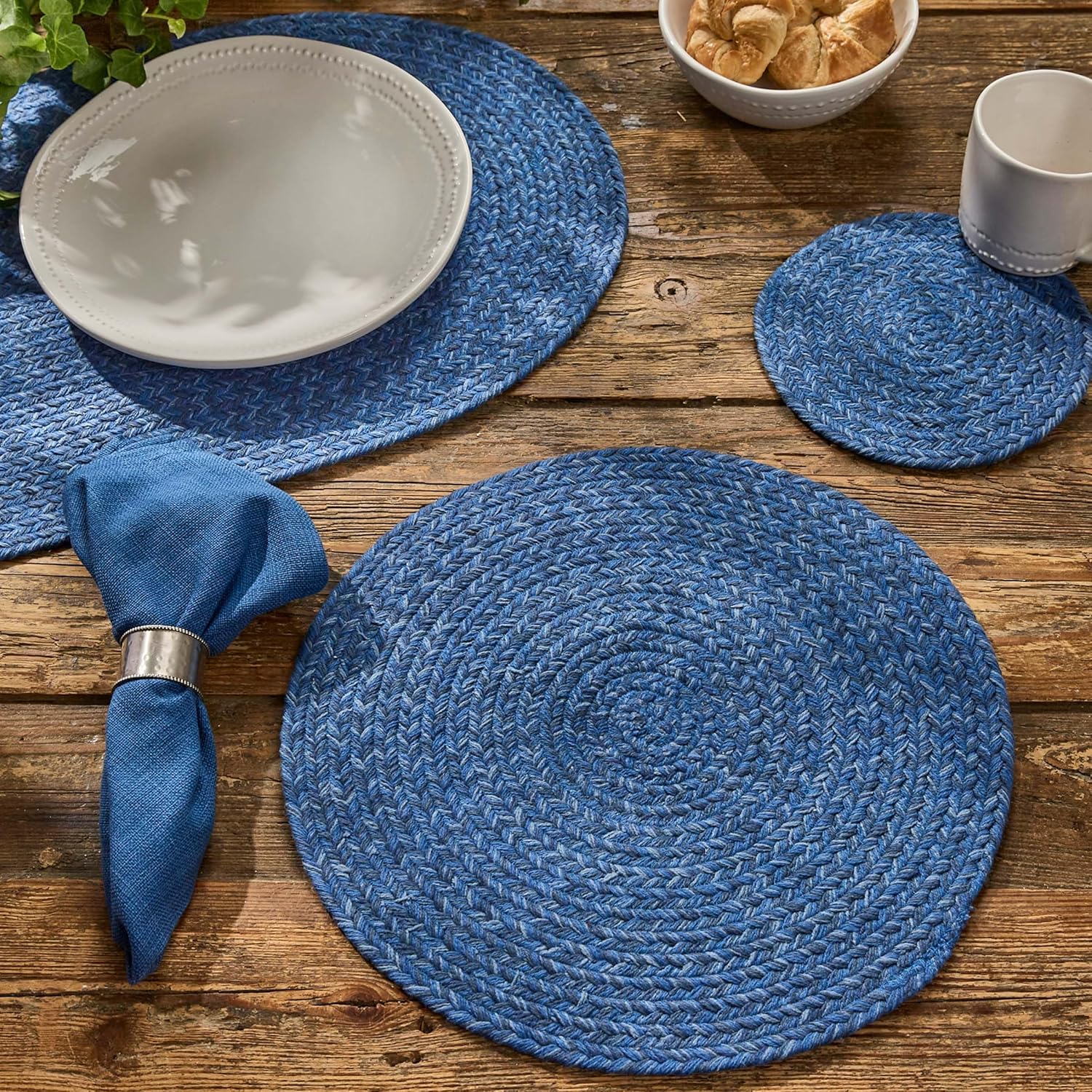 Bring in beautiful blue hues for the summer season with the addition of this set of four circular placemats. Constructed of thickly braided material with three different shades of blue for a bold backdrop to dinnerware that charmingly complements a variety of interior styles including chic, bohemian, coastal, summer, modern farmhouse, nautical, Fourth of July dining room decor and more. The woven textured surface provides a protective barrier to a tabletop from potential spills and messes created during meals in everyday, special occasion, and holiday settings. Functional and aesthetic to elevate a casual or formal dinner arrangement to showcase beautiful tableware including dinner plates, cutlery, and glassware.