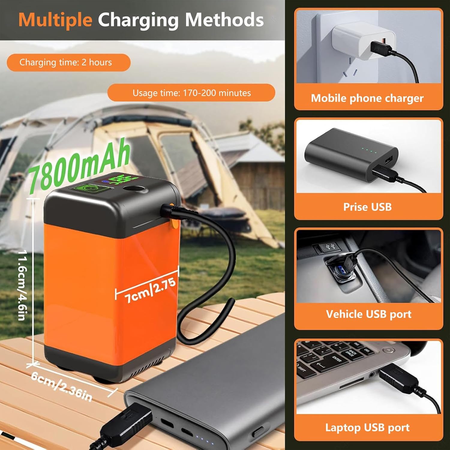 Our rinse kit portable shower is designed for maximum portability and comes with a mesh organizer bag. With its versatility and ease of use, it's perfect for beach trips, children's baths, pet's baths, car washes, and plant watering, among other uses.The camp shower pump is adjustable for high and low water output, sinks underwater and firmly grips the bucket, making it easy to control water flow and conserve water.★Note:【our camp shower pump displays the temperature but does not have a heating function】♥Specifications ♥▶ Battery capacity: 7800 mah▶ Working time: 170-200 mins▶ Material: Abs plastic▶ Hose length: 2m/6.6 ft▶ Product size: 4.6*2.4*2.7in / 11.6*6*7cm▶ Weight: 500g▶ Charging time: 2hours (depends on power source)★ Package included ★1 x camping shower pump1 x camping shower head1 x 6.6 ft (2m) hose1 x USB charge cable (no adapter)1 x multifuctional hook1 x bath loofah1 x carry bag☺Operation tips◆1. First put the pump in a bucket full of water.◆2: Wait until the pump inside the water bubbles out in the open pump. ◆3: The shower will be out of water. ☑Note: If you turn on the pump first and then fill it with water, there will be no water coming out. Then it will not work properly.