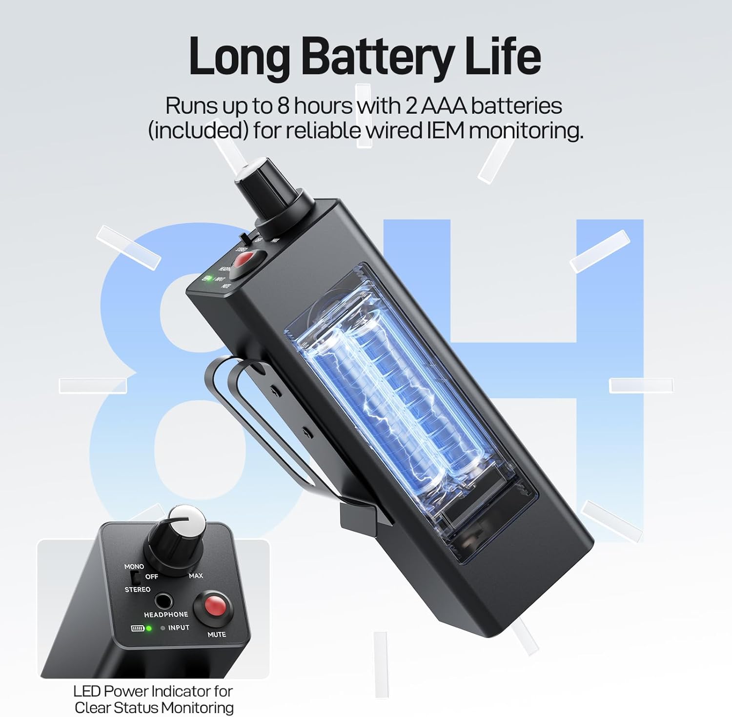 • Convenient and Reliable Design: This headphone amp features a convenient one-touch mute switch for instant silence when needed, while the XLR locking mechanism ensures a secure connection and prevents accidental disconnections. The built-in LED battery indicator clearly displays remaining power, so you’re never caught off guard. Powered by two AAA batteries (included), the in-ear monitor provides up to 8 hours of continuous use—perfect for long practice sessions or rehearsals