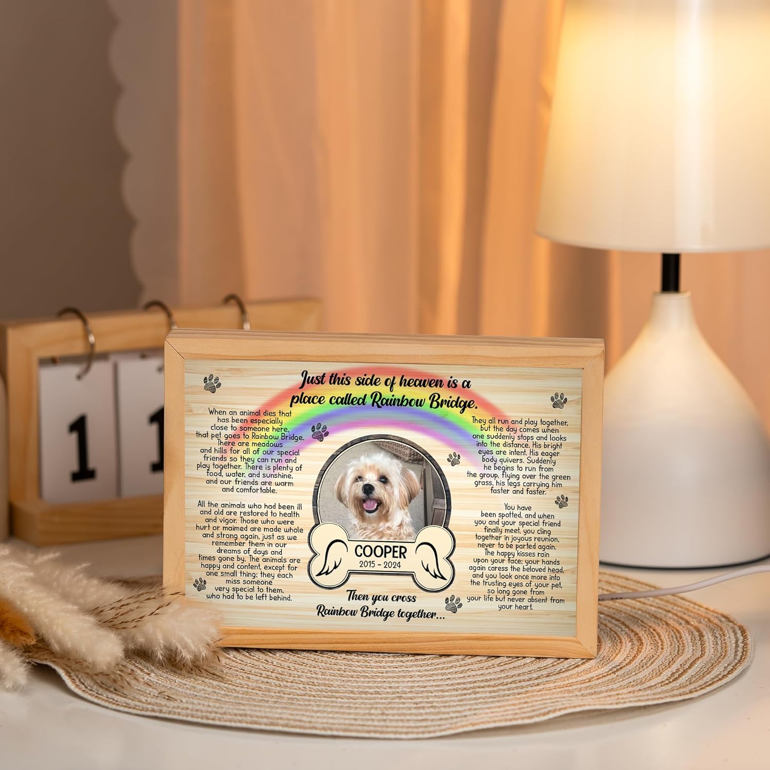 Illuminate cherished memories with our Photo Frame Light Box. Crafted from a sturdy pine wood box and sleek acrylic plaque, it combines natural wood grain with modern elegance. The box measures 21x15x3.2 cm (8.27x5.91x1.26 inches), and the plaque is 13.5x20 cm (5.31x7.87 inches). The energy-saving yellow LED strip ensures consistent illumination and safety. Convenient USB cable with control buttons allows easy setup. Perfect for pet memorial gifts for dogs, dog memorial picture frame, dog remembrance gift, and personalized pet memorial gifts. Ideal as a sympathy gift for pet loss or dog keepsake memorial.