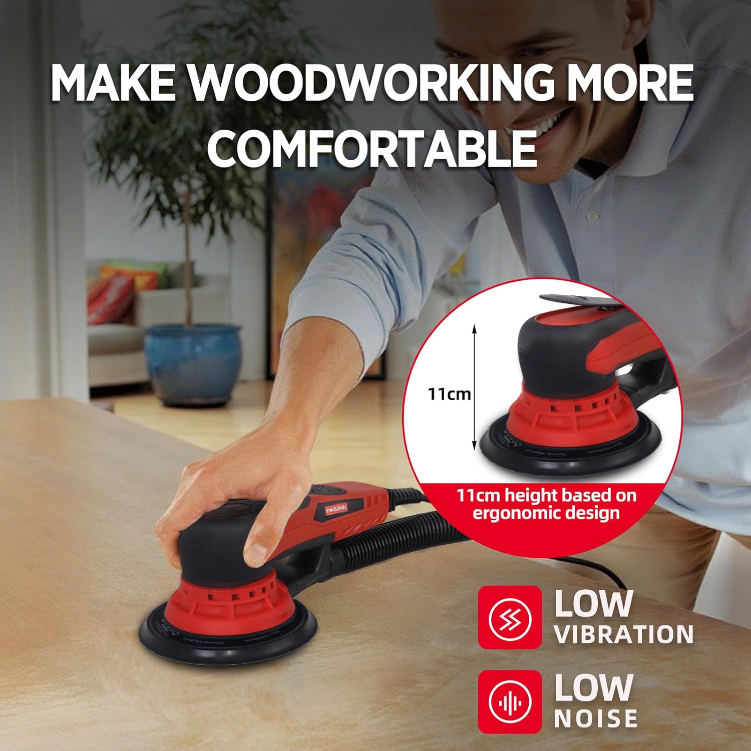 • 【Low Noise Sander】random orbital sander with a 3A 350W brushless EC motor delivers stable speed, low noise, low maintenance requirements and a high degree of efficiency. The machine’s low weight and minimal noise emissions enable flexible and low-fatigue work.