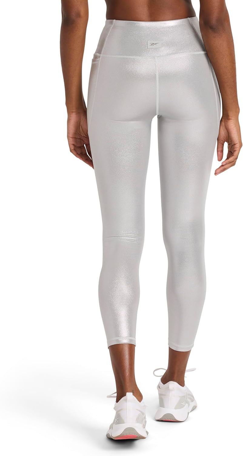 Turn heads while you turn up the intensity in the Reebok Women’s Lux Chrome HR Tight Pant. Designed in lightweight motion poly-spandex fabric, these slim-fit tights feature a full foil-printed body for a striking, high-shine finish. A high-rise encased elastic waistband, side pockets, and a silver Vector patch logo bring functional edge to your training and streetwear looks.