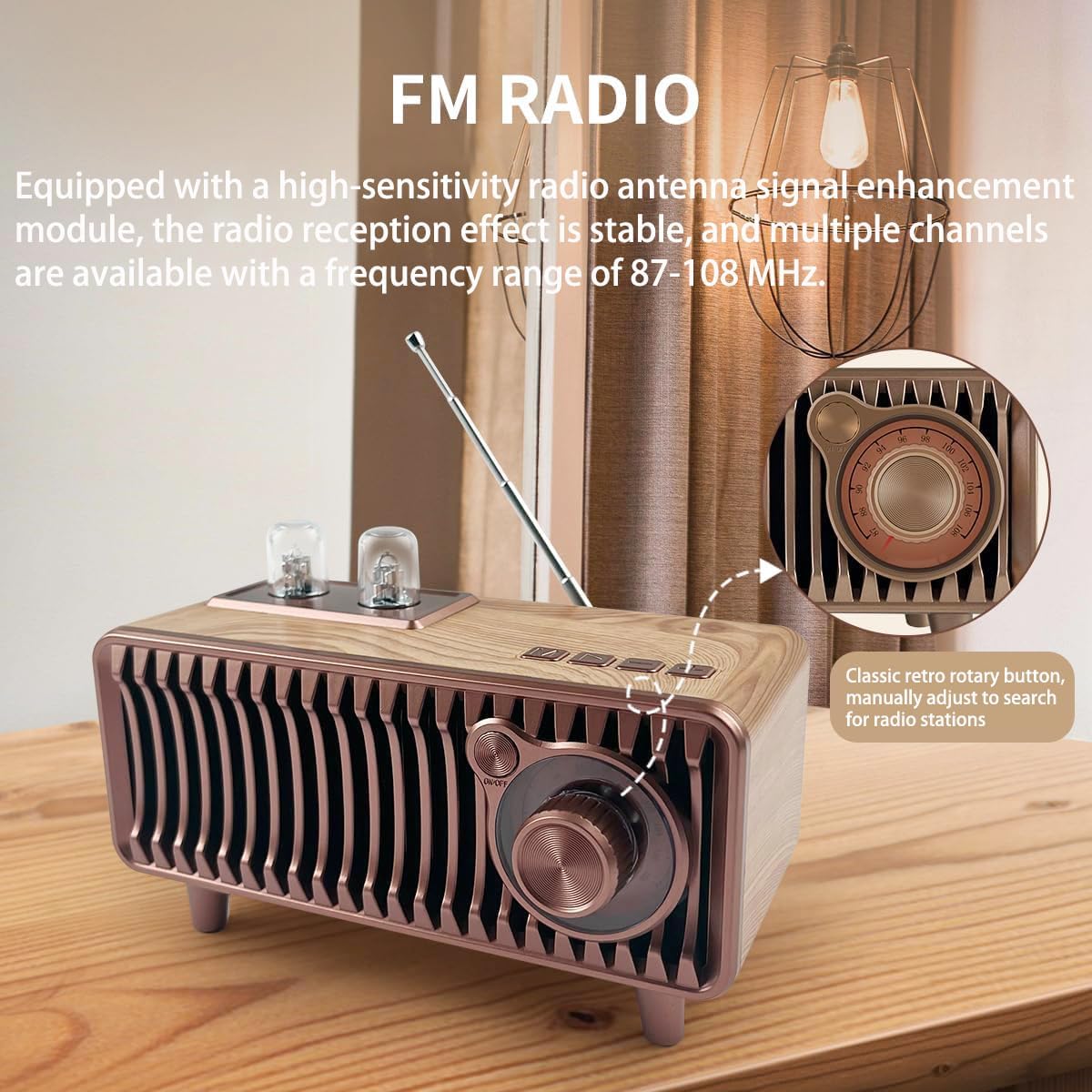 Experience the perfect blend of vintage aesthetics and modern technology with this portable Bluetooth speaker. Designed to evoke the classic charm of retro radios, this speaker features a beautiful wooden finish complemented by an elegant copper-toned metal grille. The Bluetooth 5.1 technology ensures a stable, high-quality connection with your devices, while the dual-speaker system delivers rich, room-filling sound with impressive bass response. Perfect for both indoor and outdoor settings, this versatile speaker adds a touch of nostalgia to your home office or becomes the centerpiece of your next outdoor gathering. The thoughtfully designed exterior includes intuitive controls and a convenient carrying handle, making it both functional and portable. Compatible with both iPhone and Android devices, this speaker seamlessly integrates into your digital lifestyle while maintaining its distinctive retro appeal. The combination of premium materials, reliable connectivity, and superior sound quality makes this speaker an excellent choice for music enthusiasts who appreciate both style and substance.