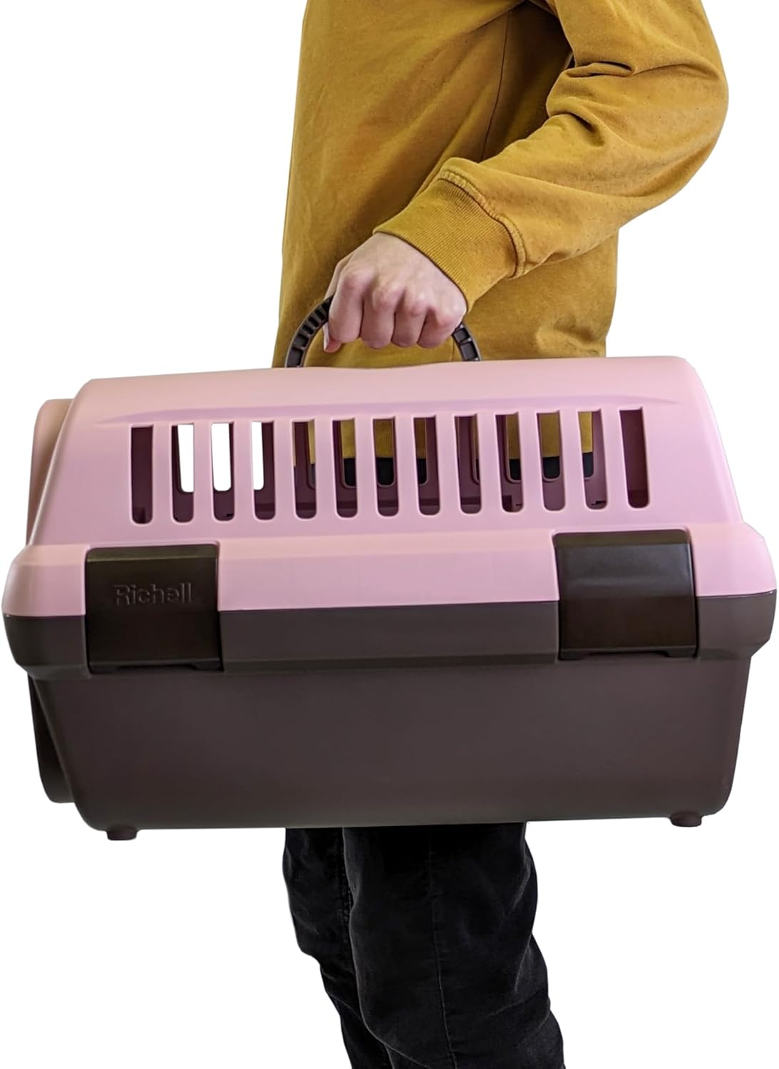 PET CARRIER II: MEDIUM - PINK - Richell’s Pet Travel Carrier is 100% made in the USA and designed to transport your pet safely from one location to another. With a comfortable handle and a clear plastic front door, this carrier is the perfect way to bring your pet along. It can be used as a pet house with the ability to take the door completely off. Featuring a seat belt latch to keep your pet safe and sound during car rides. This carrier is also fully collapsible for easy storage as well as 4 latches on the top and base for easy assembly. Because your pet is family, our Pet Travel Carriers are as comfortable for you as they are for your pet. Medium size for dogs and cats up to 17.6 lbs. Inside the carrier: (Medium) 13 x 20.7 x 12.8”H. Side door opening: (Medium) 11 x 11.6”.
