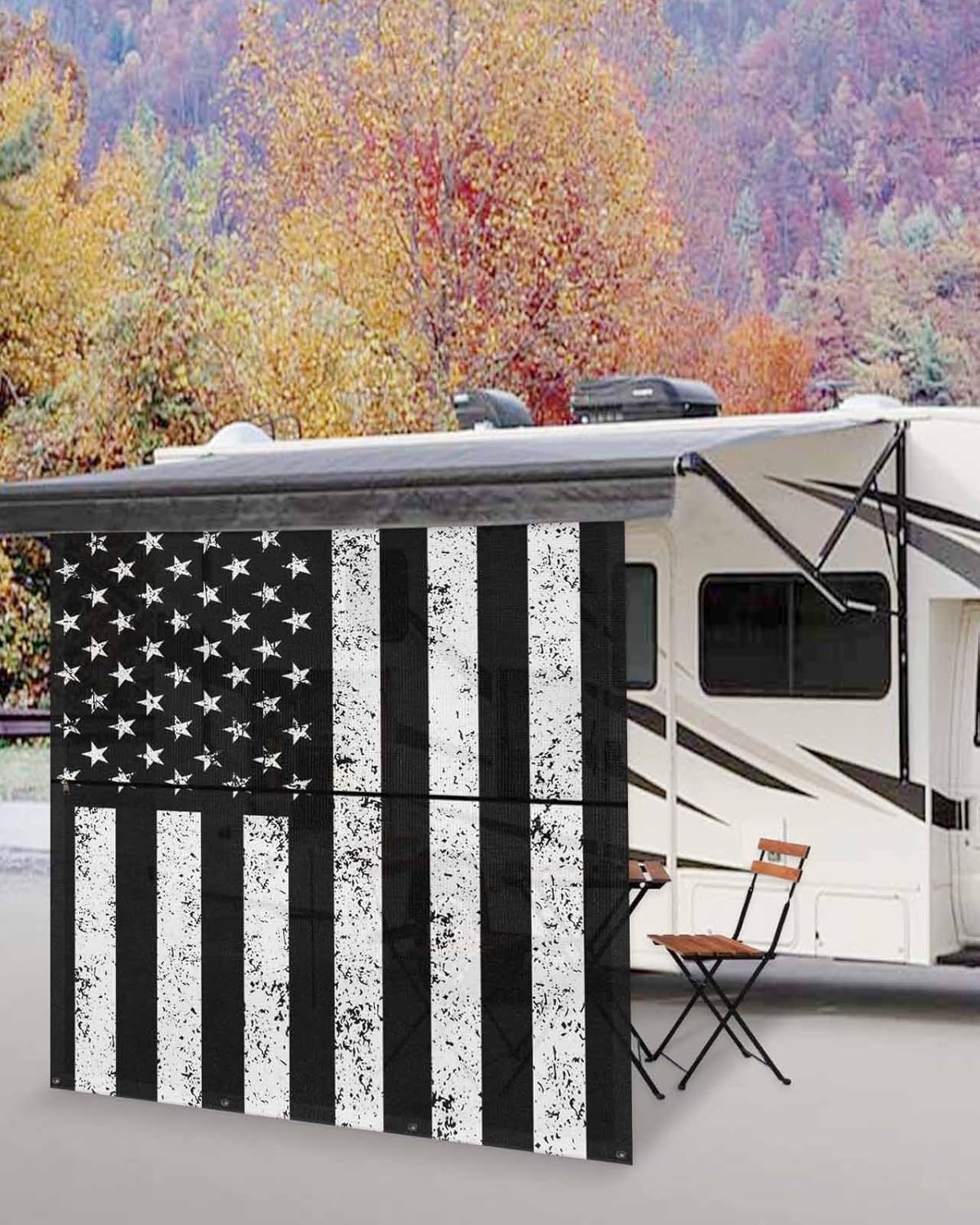 Premium High-Density Polyester Mesh RV Awning Sun Shade Screen, An Essential Addition for Camping Trips.How to Choose Your Perfect Fitted Size Method A: Please measure your existing awning from center of arm to center of arm. This 9'x7' shade has a finished fabric measurement of 9' drop by 7' length and fit for 7' RV awning.Method B: Measure your outdoor awning fabric length and choose same length of our RV shade. For example you measure your awning fabric as 7', please simply choose this 9'x7' shade.Why Choose Our RV Awning Side Shade1. These RV sun shade screen help block out those crazy sun rays that try to beat you down while camping and also give you privacy when camping right next to others.2. RV awning shade screen can be easily fixed by sliding into the RV awning rail with coming poly-cord. You just leave the upper section on to roll in and out with the patio awning and zip on the lower section when needed.3. Bungees fastest fix compared to normal rope tie down. When the winds whip up and storms come in, you just unzip it and roll in the awning and stow the bottom section with the bungees, it's that easy.4. High-density material mesh has better durability and will retain its color after long-term use.The bottom of the RV awning screen is equipped with 4 thick grommets that no crack by strong pulling and can be used normally in extreme weather.5. The RV awning side shade screen helps avoid your RV awning from being blown down and damaged by the wind.6. This mesh awning sun screen is designed to fit a wide range of popular awning systems, ensuring versatility and ease of use.We provide a variety of color options: Black, White, Blue, Green, Orange, Grey...Package Include4 x Plastic Stakes4 x Bungee Cords1 x Awning Shade Screen 9' x 7' (9 Feet Drop, 7 Feet Length)