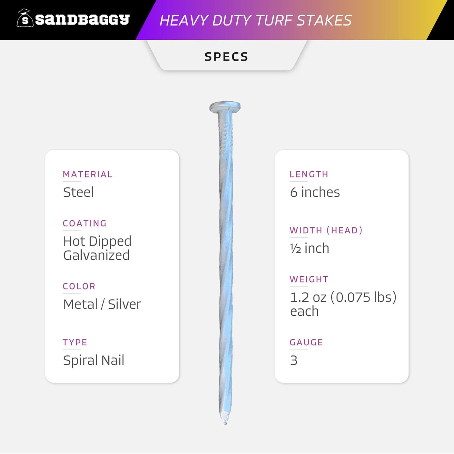 Install & hold down artificial turf, even in the hardest rockiest soils, with Sandbaggy Galvanized Artificial Turf Stakes! The strongest turf stakes you're going to find on the market, made from extra thick steel, they're way thicker than your basic turf stake. And of course, they're way stronger than those brittle plastic stakes or flimsy landscape staples. Once installed these spiral landscape spikes won’t budge! The spiral design ensures a quick and reliable hold, preventing any shifting or loosening of the artificial turf. Crafted to endure even the harshest conditions, our nails have double the rust protection with a hot-dipped galvanized coating. They also make great landscape edging spikes or garden stakes.