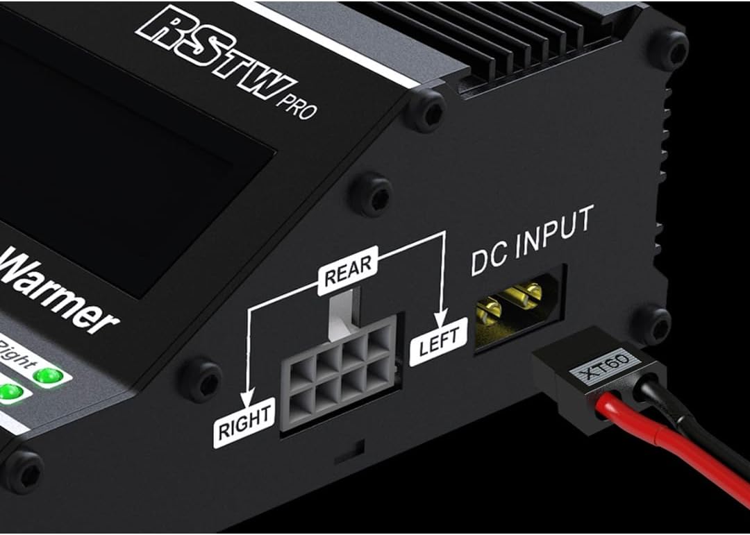 Why do you need a Tire Warmer? Firstly, the Tire Warmer makes the surface rubber of the tire hot, so that the rubber can fill the little crevices of the track better, providing better grip in the early stages of the race. Having the surface rubber hot increases the coefficient of friction of the rubber, adding to its ability to grip the track surface. Secondly, using Racing Star Tire Warmers gives you the advantage of the tires being ready as soon as you roll out onto the track. 1. DC JACK Located on the left side of the tire warmer is a jack for the connection of the DC power cord. To utilize the tire warmer’s absolute maximum capability, th 2. XT60 CONNECTOR Also located on the right side of the tire warmer is secondary XT60 Connector. This jack is designed for power on the tire warmer with 4S LiPo battery via XT60 connector, no need any other cable.e DC power source must be capable of delivering at least 8 amps while maintaining 12V DC. Special Features Dual Power Source: 4S LiPo battery pack and 12-18V DC input. Front & Rear temperature can be set independently Temperature of 4 tires is controlled by MCU Removable front & rear tire warmers 8 different beep tones Minimum temperature Celsius - Fahrenheit selectable display Four LED indicators Safety timer Intuitive User Interface Large LCD Display Screen Four choices Up, Down,Left,Right set with the Joystick. Four LED indicators The LED indicates red when the temperature of the tire warmers is warming. The LED indicators turn green once finished What’s in the Box Tire Warmer Controller Front Tire Warmer Cups Rear Tire Warmer Cups DC Input Cable