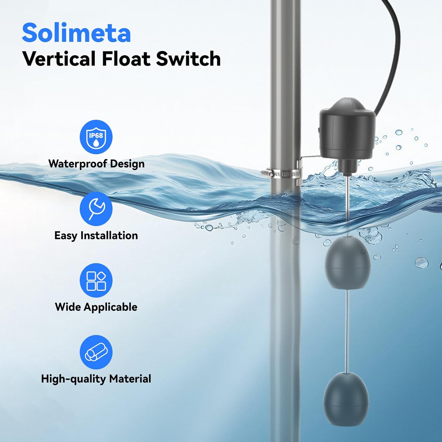 Description Solimeta Dual Float Switch with 12FT Cable, Mechanical Sump Pump Float Switch for Sump pump, Basement Sump basin, Pumps & Plumbing Equipment Dual Float & Adjustable Water Level Control Two independent floats allow customizable high/low water level settings by simply adjusting the distance between them, ensuring precise and reliable pump control. Auto/Manual Switchable Operation Offers ultimate flexibility with a simple switch to choose between fully automatic operation and manual override, providing direct control when needed. Stable in Turbulent Water Its mechanical design is insensitive to water agitation, preventing false triggers for consistent performance in sump pumps and sewage applications. Fits Confined and Large Spaces The compact design installs easily in tight spots like small sewage chambers or sinks, while also being effective in large water tanks. IP68, 12FT Cable & Full Kit Built with IP68 waterproof protection and a long 12-foot cable. Includes all necessary mounting brackets and clamps for a quick, secure installation.