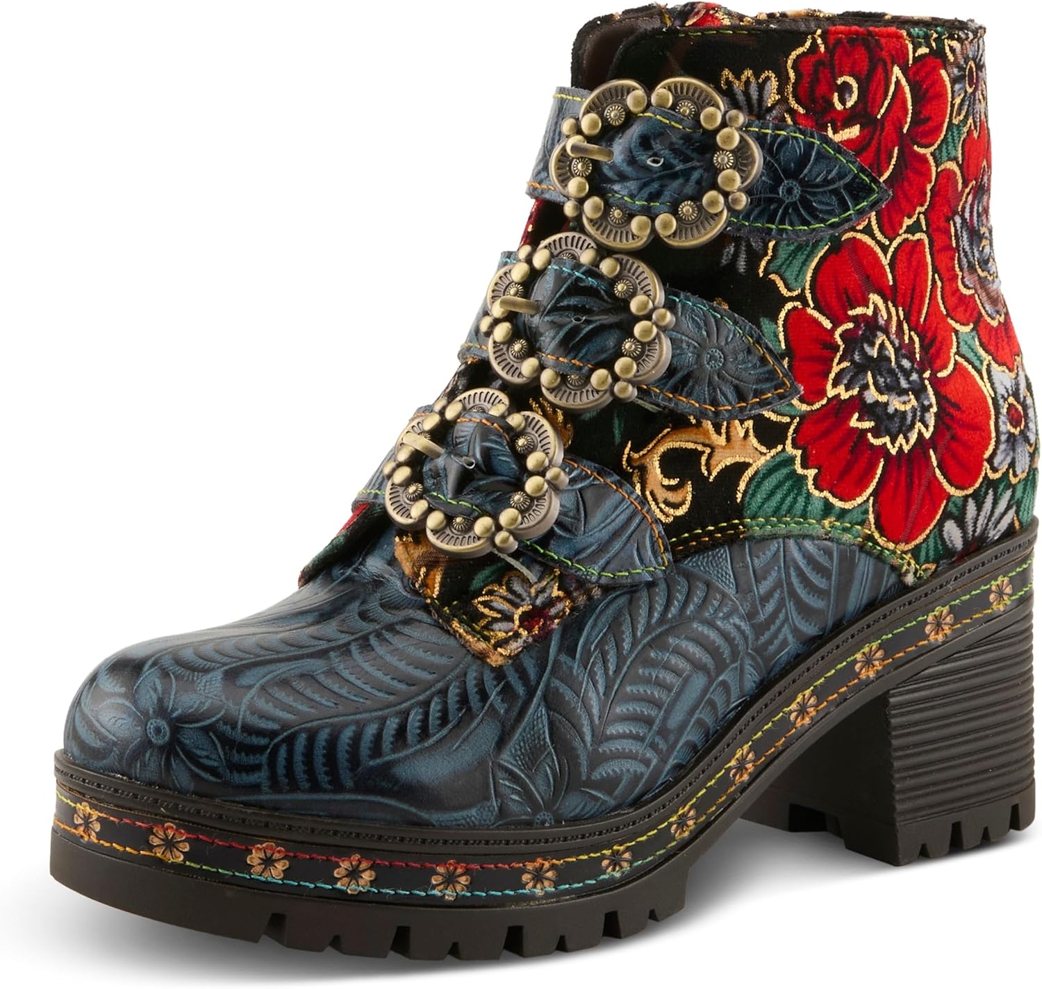 Make a bold fashion statement with the L'Artiste Brazza Platform Booties, a perfect fusion of boho-chic elegance and modern edge. Crafted with a luxurious leather-textile combo upper, these ankle boots feature intricate floral embroidery for a unique artistic touch. The adjustable buckle straps enhance the style while ensuring a secure fit, complemented by a convenient side zipper for easy on-and-off wear. A chunky decorative lug sole provides durability and grip, while the cushioned faux fur lining and insole offer superior comfort. Step into confidence and creativity with every stride in these standout boots.