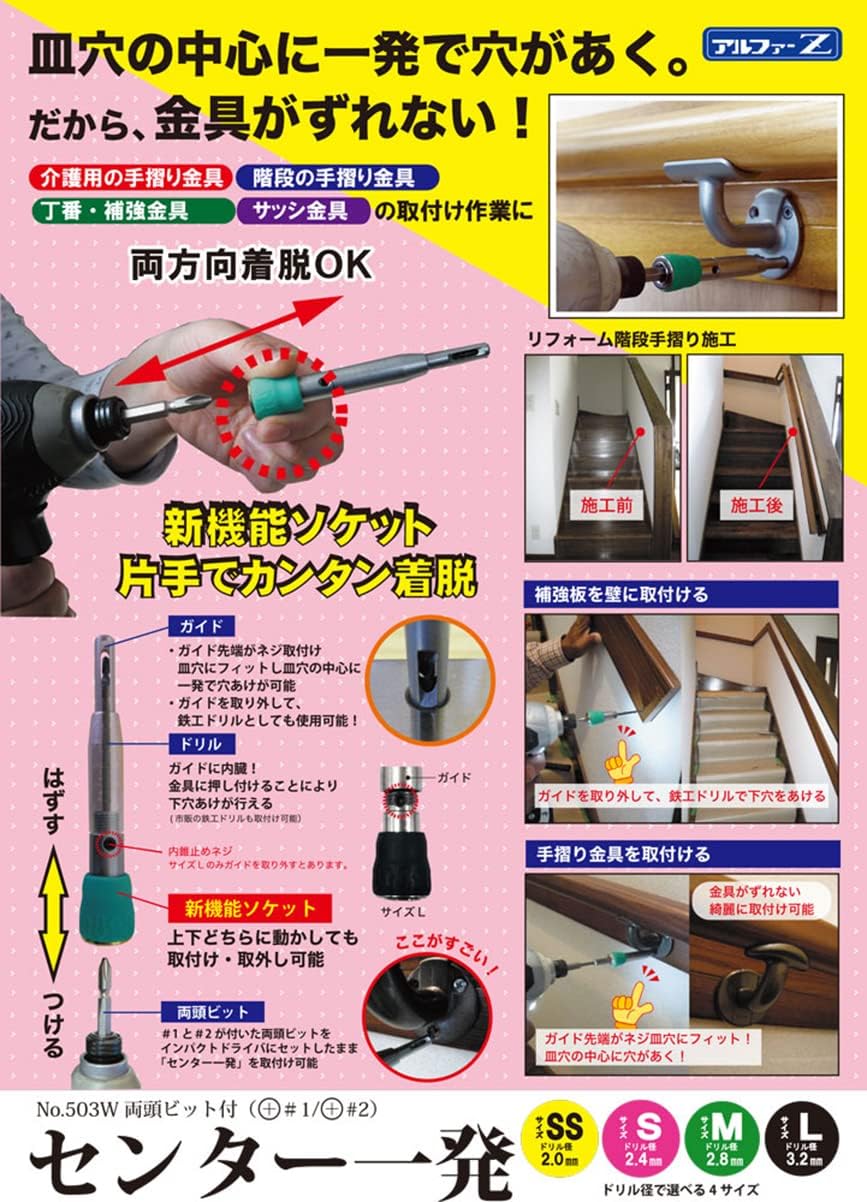 Holes are drilled in the center of the screw mounting holes. [Use] 0.08 inch (2 mm) drill for mounting handrail fittings and hinges. Features: Can be drilled in the center of mounting holes on handrail fittings, hinges, and reinforcement hardware. Two-way detachable chuck makes it easy to put on and take off the bit. Can be used with impact drivers. [Precautions] Use with electric tools less than 2,500 rpm.