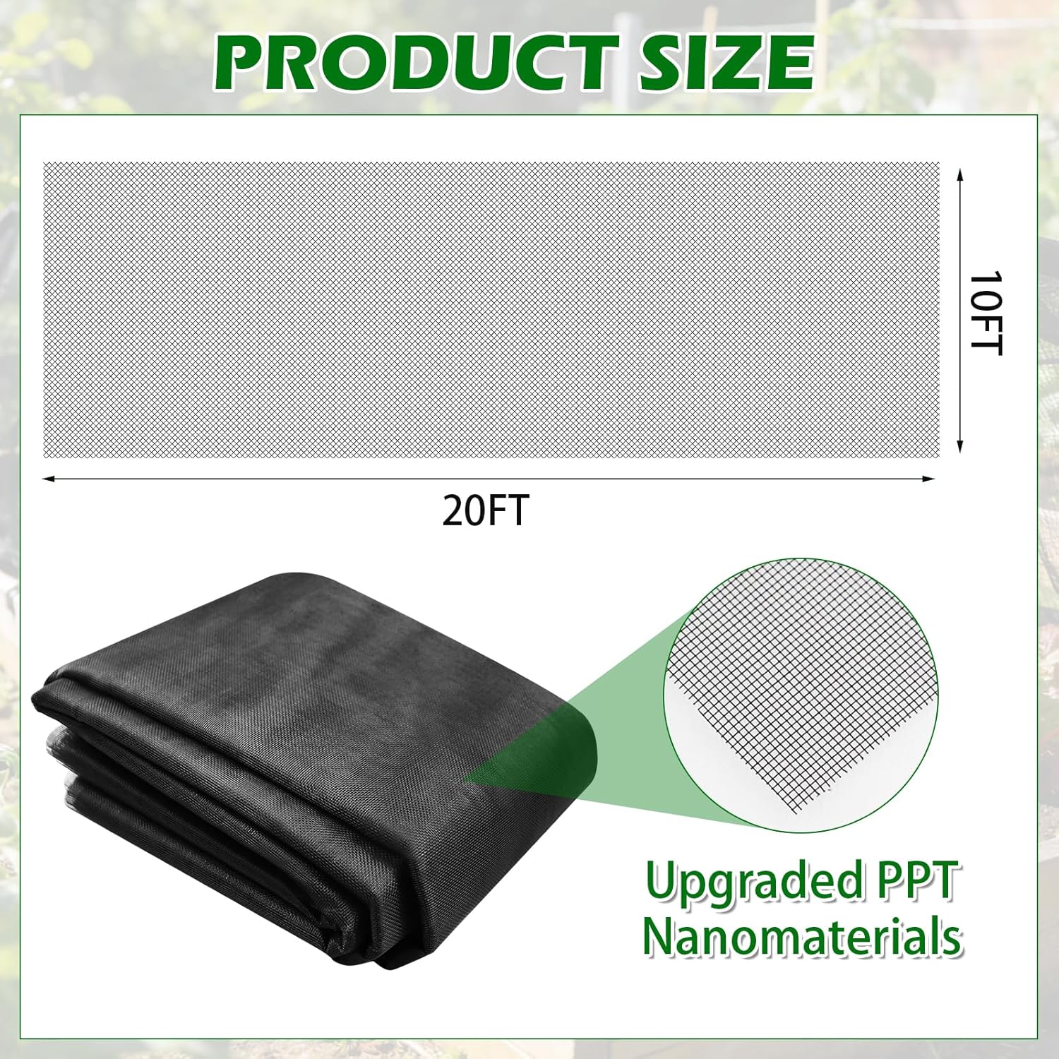 Discover reliable plant coverage with our Garden Mesh Netting. Crafted from durable PPT Nano material, this 20ft x 10ft black barrier offers tear-resistant strength for long-term use in outdoor spaces. Its lightweight, breathable design maintains airflow and visibility while providing customizable protection for raised beds, greenhouses, and row covers. Versatile for multiple settings. The dense mesh easily adapts to fruit trees, vegetable patches, flower beds, and blueberry bushes. Use it on balconies, terraces, decks, or gazebos to create shaded areas during warm months. The 33% shading rate delivers cooling relief from direct sunlight for plants and seating alike. Simple setup and lasting performance. Cut to size as needed and secure with ties or stakes for quick installation. This reusable netting supports year-round garden care, from spring growth to summer harvest, across patios and backyard layouts.