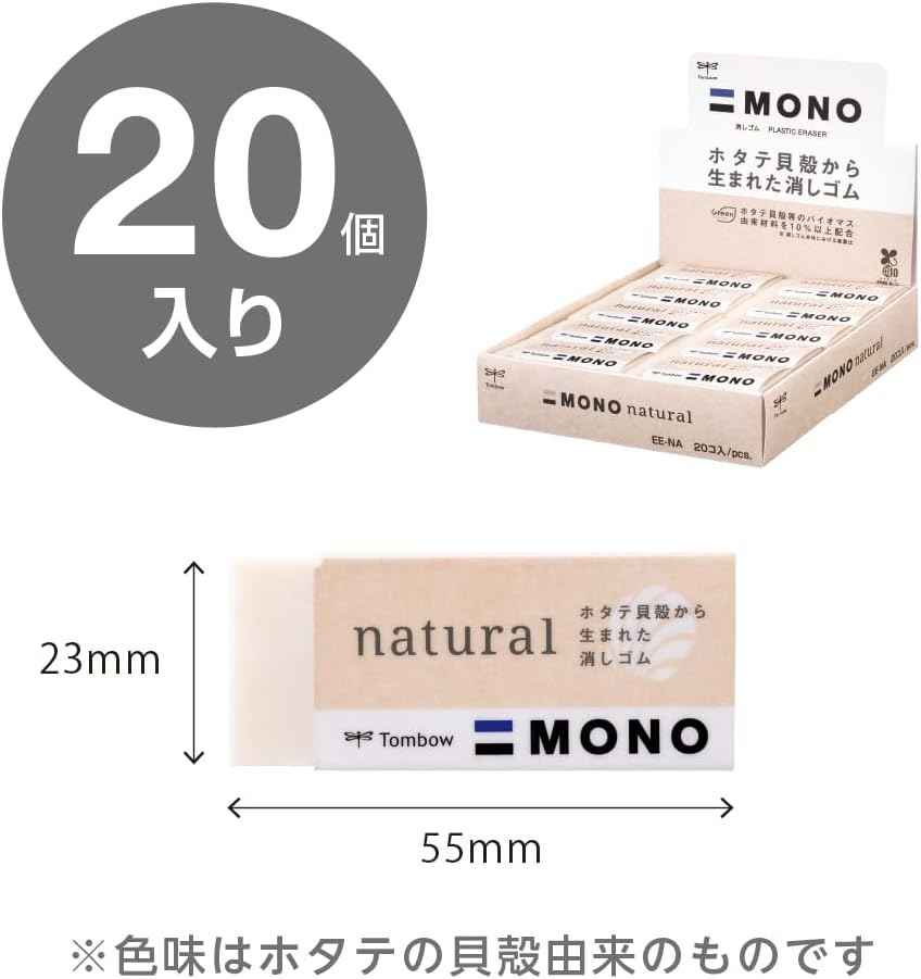 This is an eco-friendly eraser with a mix of biomass material derived from scallop shells and more than 10% weight ratio of the eraser. It has the same erasing power as a traditional "mono" eraser, while reducing the amount of petroleum derived ingredients. Product Features Formulated with biomass ingredients such as scallop shell powder. Scallop shell color is gentle 95% or higher than traditional mono eraser (according to JIS standard) The erasing effect is smooth and easy to erase. Slightly harder than the mono (PE series), and the eraser is low-key