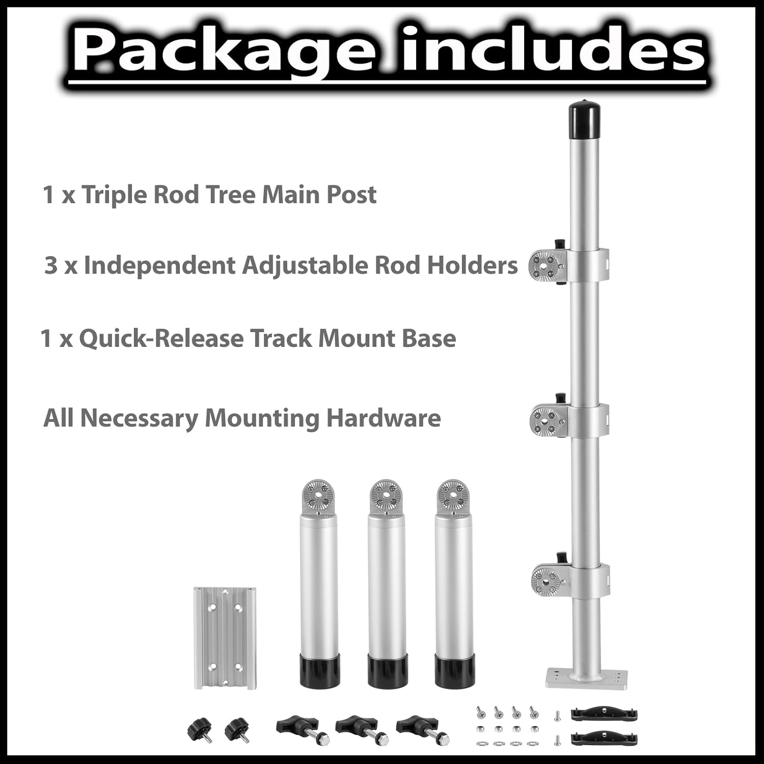 | Included Components | 1 x Mounting Hardware, 1 x Quick-Release Track Mount Base, 1 x Triple Rod Tree Main Post, 3 x Independent Adjustable Rod Holders |