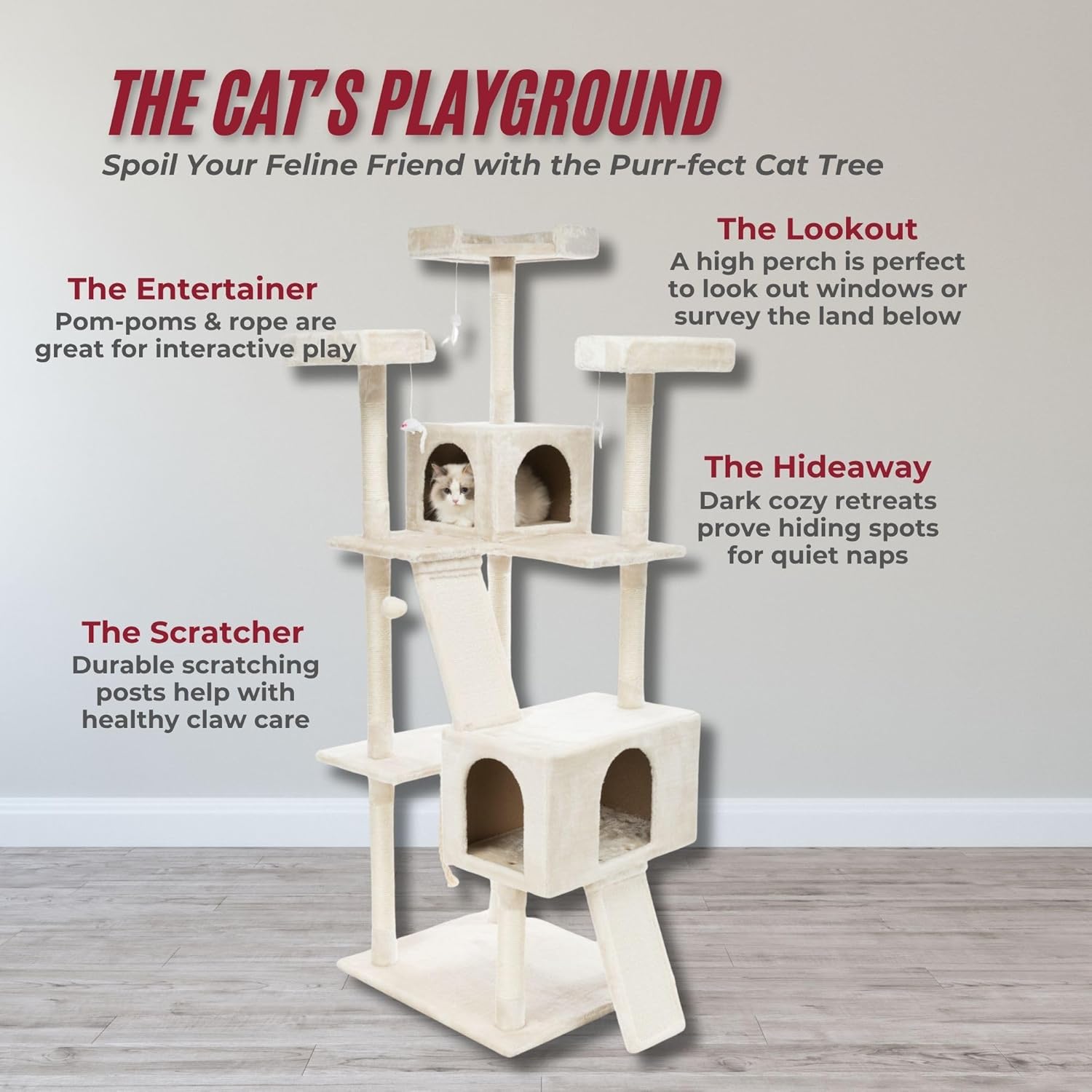 The TRIXIE Celeste Cat Tower XL is a fun-filled, feline playground. It will provide endless opportunities for cats to play, explore, scratch or just relax. Felines can sharpen their claws on the three tall scratching columns instead of on your furniture or carpet, giving them a healthy outlet for their scratching instincts. The scratching columns are covered in durable sisal. If a nap or place to hide is in order, the cat can crawl inside one of the two kitty condos. Feeling a little spunky? Jump, climb or perch atop the plush covered platforms and lie in wait for unsuspecting prey or simply enjoy the view. For added comfort and security the top three platforms include raised edges. For even more feline fun, Celeste features two climbing ramps that let your cat really run up the tower. The climbing ramps double as additional scratching surfaces with sisal tops. Plus a sturdy rope for tempting more play. Also included are four dangling toys that are sure to pique your curious cat's interest. Suitable for cats of all ages and activity levels.