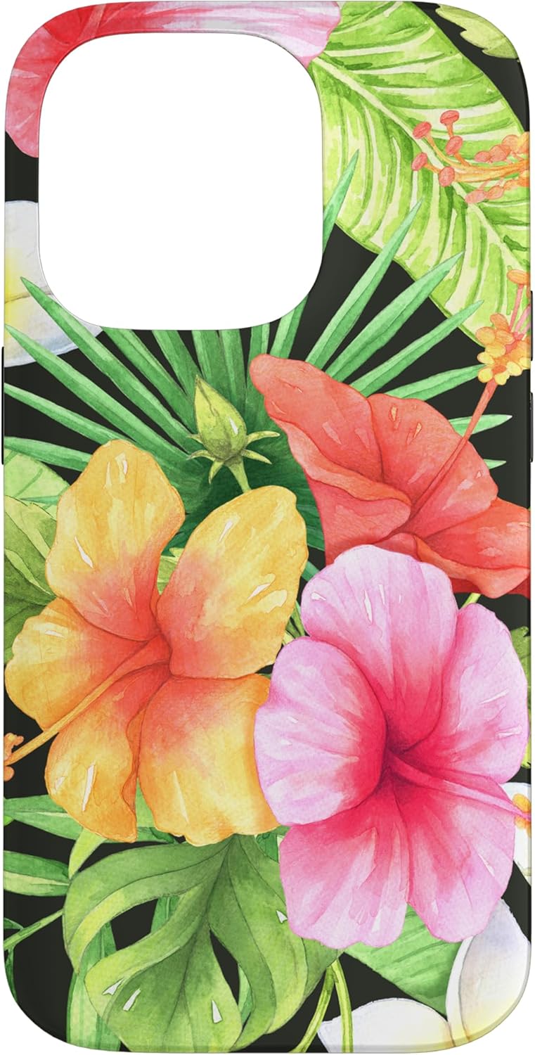 If you love spring time and summer holidays or you search vacation gifts for women and girls, grab this unique graphic of hawaiian summer elements with black background. Perfect hello summer graphic with watercolor hibiscus flowers. Make women and girls happy with this cute aloha hawaii aesthetic phone accessories and enjoy summer vacation gifts. Tropical Hibiscus And Palm Leaf Pattern Cute Hawaii Floral Pattern For Women And Girls.
