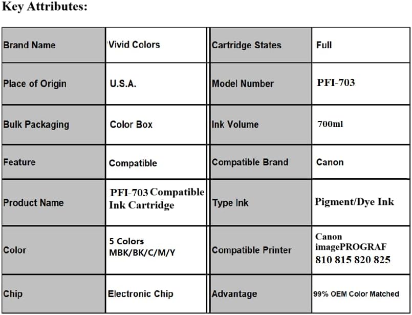 Our PFI-703 Matte Black compatible ink cartridges are manufactured to OEM (Original Equipment Manufactured) quality and performance standard and provide the same page output. The print quality can be seen in every print, for a fraction of the cost. The vivid color printing compares to OEM color density with wide range color gamut. 100% satisfaction accurate consistent quality performance guarantee. is filled with 700ml/per cartridge.