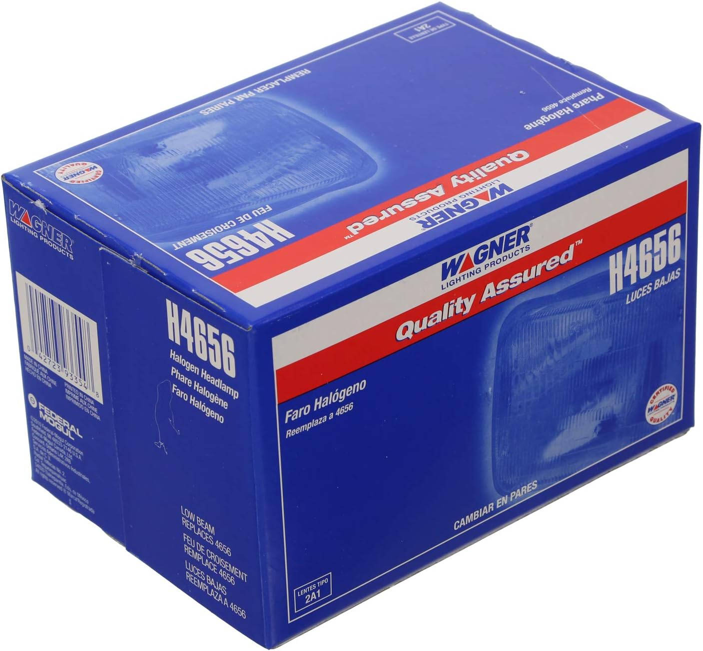 The Wagner H4656 headlight is designed to deliver a brighter, whiter light for improved visibility and safety. This incandescent headlight features an extra strong filament that withstands vibration and coated terminals to prevent corrosion. The non-reflective bottom shelf reduces glare in rain, snow and fog. DOT/SAE compliant for compliance with Department of Transportation and Society of Automotive Engineers standards, this headlight is available for passenger cars and light trucks, commercial and off-highway vehicles, agriculture, industrial and powersports applications. This headlight provides comprehensive coverage and is made by Wagner Lighting.
