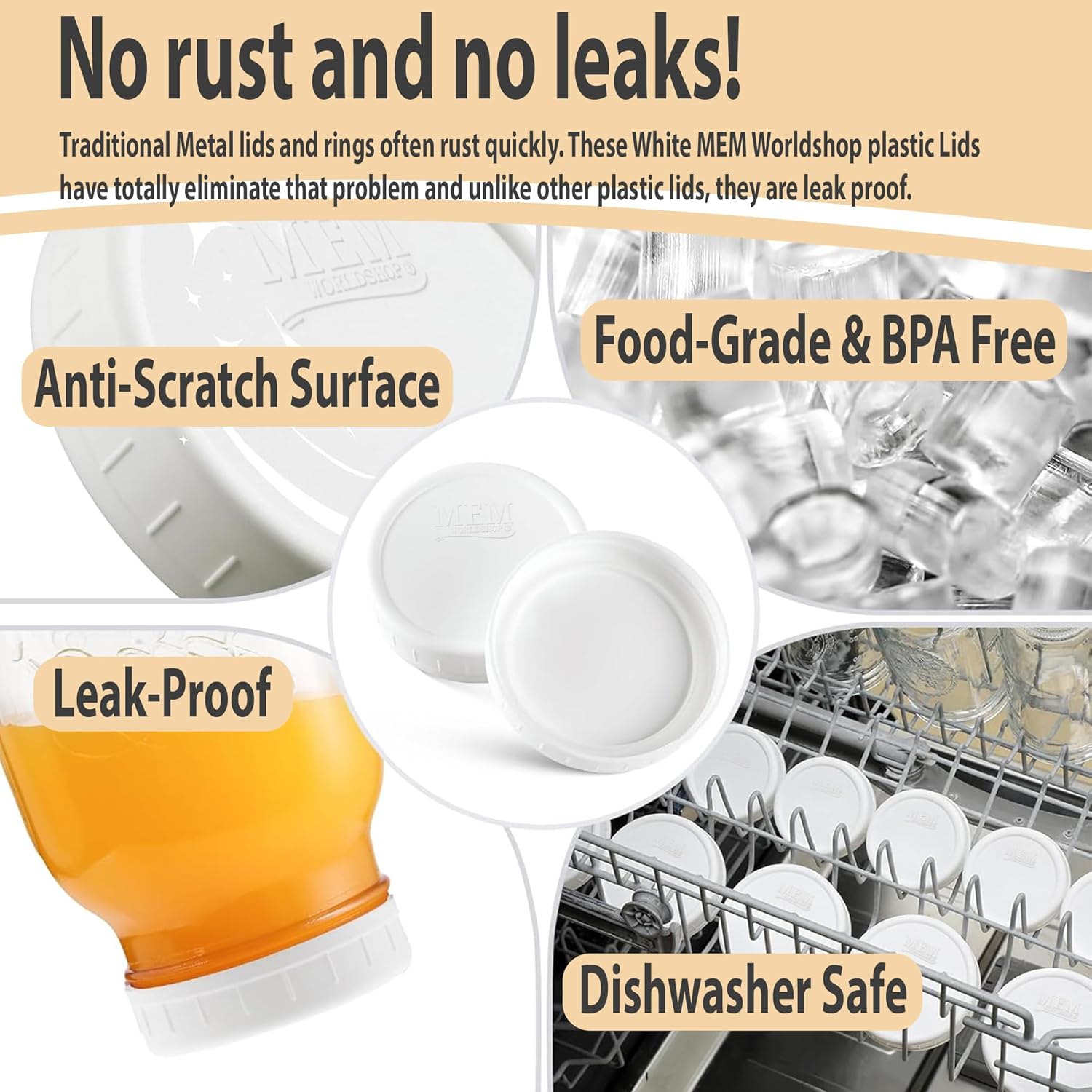 | Material Features | NEW & IMPROVED AIRTIGHT SILICONE RING SEAL - Featuring an Improved Built-in Silicone Ring Seal, M.E.M Wide Mouth Lids Effectively Block out Air Moisture, Making them Ideal for Storing Dry Goods like Cookies, Candy, and Nuts. These 64 oz Wide Mouth Mason Jars are also Proven to Keep Sliced Fruits, Vegetables, Pickles, Salsa, Jelly, Pie Filling, Jam, Meat, and Sauces Fresh Longer and Tasting Fresher, Making Them Perfect for Any Kitchen, Restaurant, and More. |