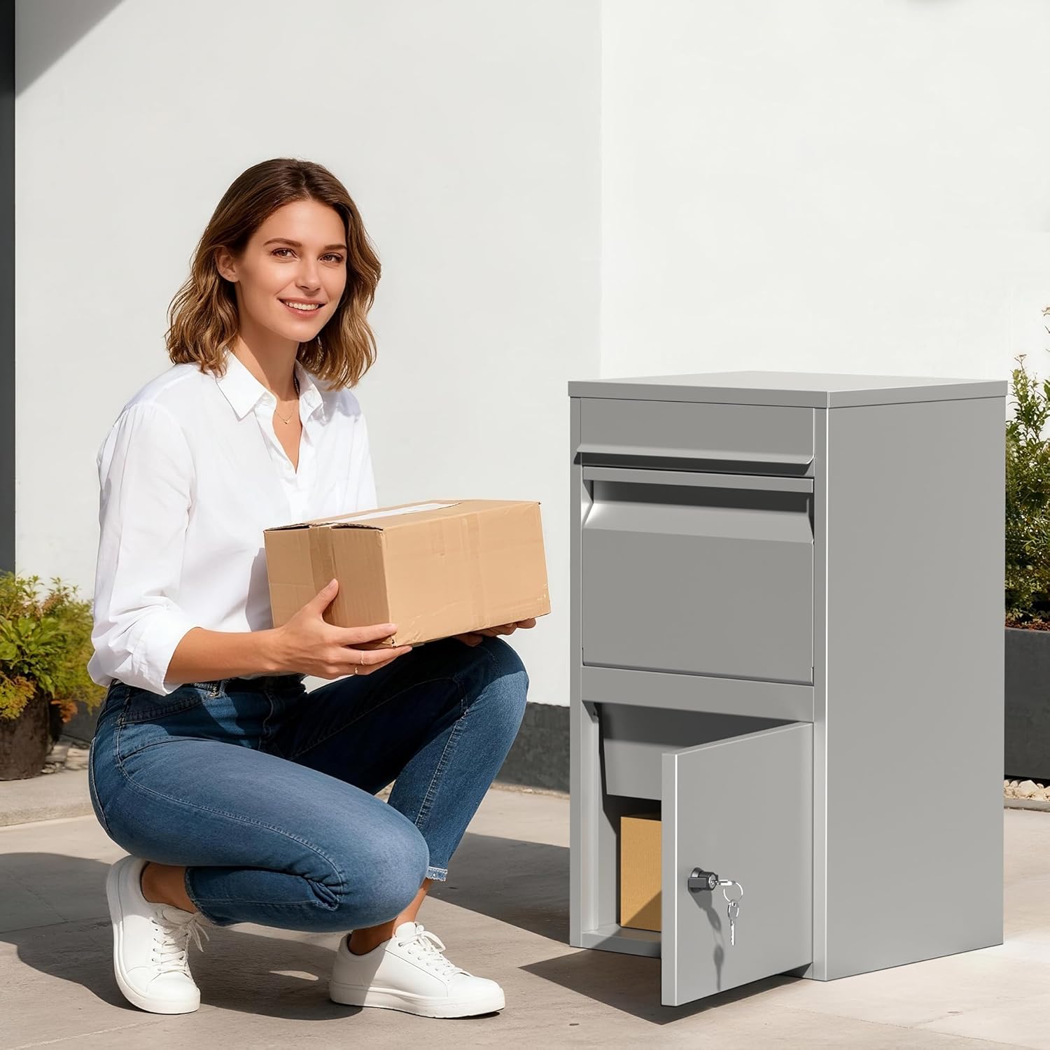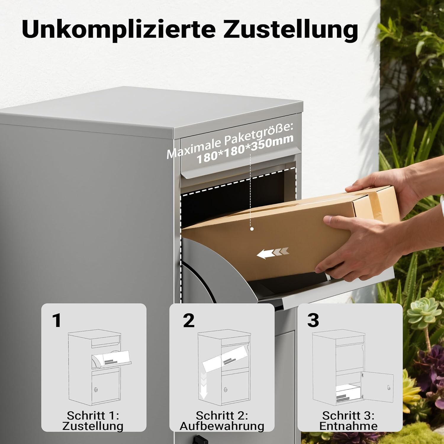 Robust parcel box for secure deliveries The parcel box provides a convenient way to safely receive parcels and postal items at home, even when absent. With its dimensions of 410 x 380 x 720 mm, it offers plenty of space for different sizes and makes it easier to organise daily parcel delivery. Its gray color fits discreetly into different outdoor spaces and contributes to a neat overall appearance. Powder coated steel construction The parcel box is made of galvanized steel with a powder coated surface. This makes it weatherproof and provides a stable base for secure storage of parcels and mail. This combination ensures reliable protection of the content from external influences. Lockable system for added security An integrated lock effectively protects shipments inside from unauthorized access. The parcel box is therefore ideal for households that receive regular deliveries and need a reliable way to safely store their parcels while they are away. The secure locking system promotes orderly delivery of mail on a daily basis. Practical solution for everyday use The freestanding mailbox is designed in a way that makes it easy to drop off and pick up packages. Thanks to its robust construction and clear structure, the parcel box is suitable for both single-family and multi-family buildings. It facilitates the reception of packages and ensures that shipments can be kept safe at all times. Benefits for home use The parcel box combines a robust steel construction, easy-care coating and a lockable system. Thanks to its size and functional design, it offers a reliable solution for secure parcel reception, mail delivery and orderly storage of shipments.