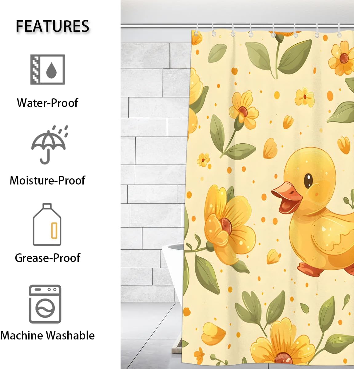 Decorative shower curtain with Yellow Duck Flower design, easy to match your bathroom. Polyester shower curtain create relaxing harmonious bathing atmosphere, elevate eye-catching decor to bathroom. Material: Polyester Fabric Size:72 x 72 inches(183 X 183 cm) Pack: 1 X Shower Curtain for Bathroom 12 X C-shaped Plastic Hooks (Rod not included) Premium Material Bathroom curtain is made of waterproof polyester fabric, soft. Precise threading at the bottom of cute shower curtain, makes bathroom shower curtains durable for long-term use. Shower curtain fabric rely on their own weight to keep the shower curtain sagging, no need extra weighted hem. HD Pattern & Easy to Clean Cloth shower curtain with 3D printing technology, vibrant colors and clear images. Decorative bathroom bath curtain decor is washing machine safety, fast drying. Easy Installation Long shower curtain with 12 C-shaped plastic hooks, fits most bathtubs and showers. Easy installation on shower curtain and easy sliding. You can use waterproof shower curtain set to decorate your bathroom, wall, window and any space where you like. Multiple Purposes Farmhouse shower curtain can be used as hotel home room partition backgrounds, party backdrop, closet door curtain, dorm room window curtain. Fabric shower curtain is ideal gift at housewarming birthday Halloween Christmas Mother's day for mom, friend, family and colleague.