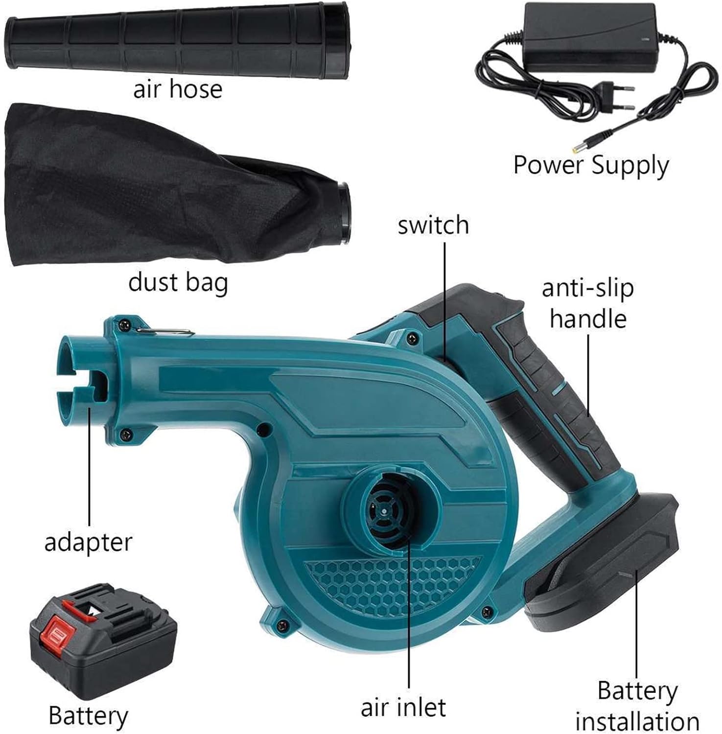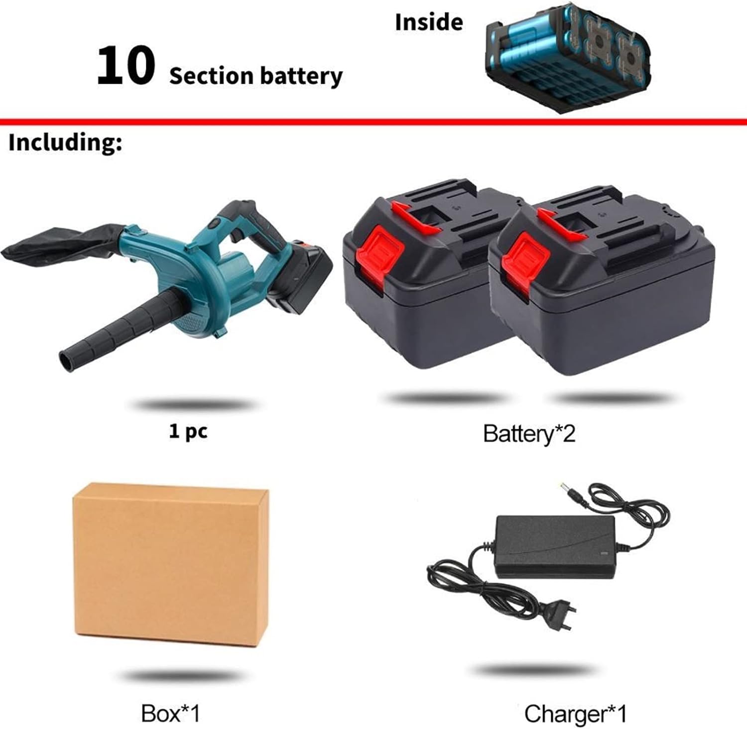Specifications:Product Name: 2 In 1 Cordless Electric Air BlowerColor: BluePower: 3000WVoltage: 398VFBattery: 35800 mAhRevolutions Per minute: 30000 RPMPackage Included:- Pattern 1:1 * Air blower1 * Dust bag1 * Air hose1 * Packing box1 * Manual- Pattern 2:1 * Air blower1 * Dust bag1 * Air hose1 * Packing box1 * Manual1 * Charger1 * 5 Section battery- Pattern 3:1 * Air blower1 * Dust bag1 * Air hose1 * Packing box1 * Manual1 * Charger2 * 5 Section battery- Pattern 4:1 * Air blower1 * Dust bag1 * Air hose1 * Packing box1 * Manual1 * Charger1 * 10 Section battery- Pattern 5:1 * Air blower1 * Dust bag1 * Air hose1 * Packing box1 * Manual1 * Charger2 * 10 Section battery