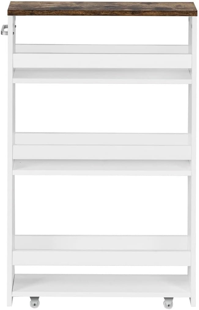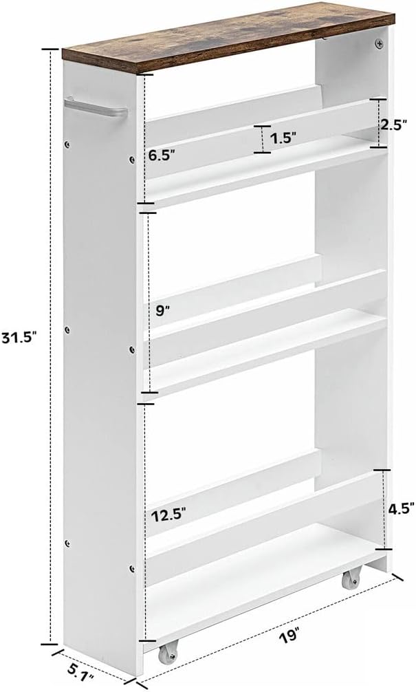 Features:4-tier storage layers offer you large space to organize thingsUtilize every narrow gaps in your room to storage itemsConvenient movable design with 4 smooth casters and side handleProtection bars to prevent your things from falling downmaterial ensures and sturdy structure and high weight capabilityaesthetic design makes it easy to match different decoration stylesCasters can be hidden behind lengthened side boardSpecifications:Color: white + wood grainMaterial: P2 MDF, engineered woodOverall Dimensions: 19" x 5.1" x 31.5"(L x W x H)Net Weight: 11 lbsWeight Capability of Top Board: 22 lbsWeight Capability of Each Shelf: 7 lbsPackage includes:1 X storage cart1 X instructionNoticeManual measurement has been used, there may be some reasonable errorDue to factors such as display equipment and shooting environment, the color of the item may be slightly different from the picture, which is a normal phenomenon, please refer to the actual itemIt is evenly colored and known for its hardness.