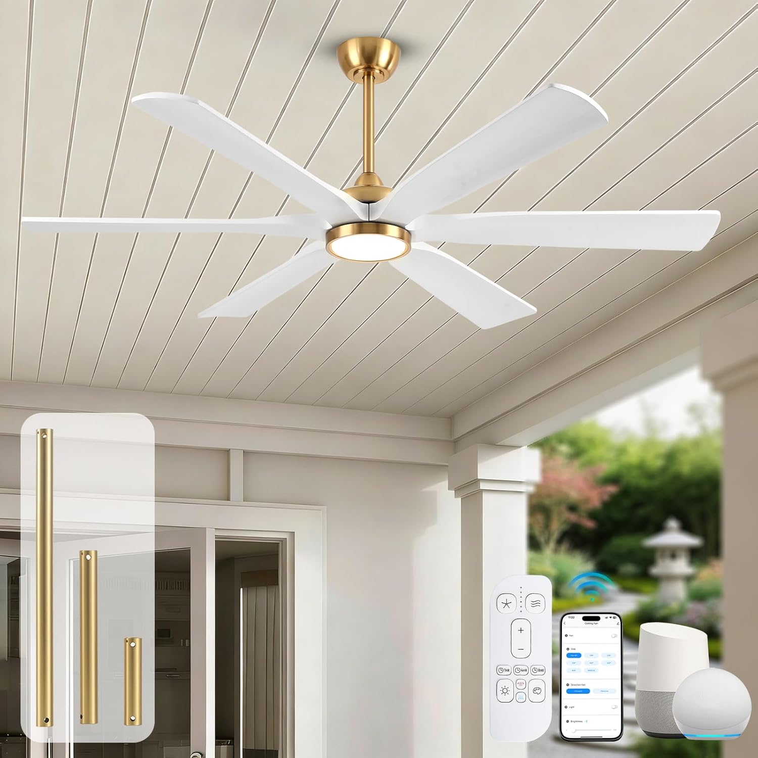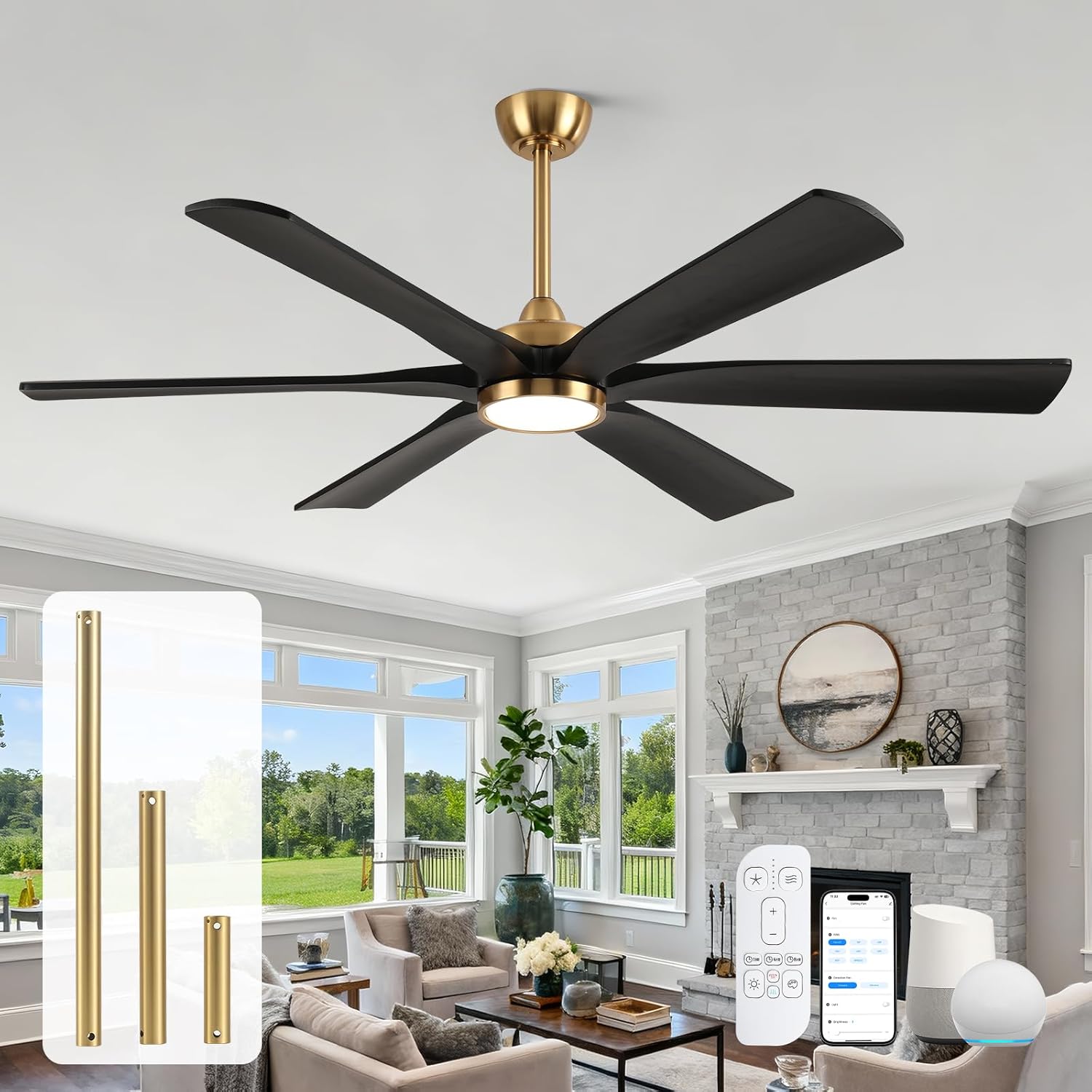 | Special Features | 6-blade black and gold solid wood ceiling fan with light, modern, simple, and stylish; sturdy, durable, and moisture-proof., easy to install, with detailed english instructions. high low sloped ceiling ceiling fan (sloped of <20°), 3 down rods(6"/12"/24"), high cfm, quiet, and energy-efficient dc motor, suitable for all four seasons (summer and winter)., high-quality led light panel, providing soft and non-glaring light. ETL, FCC listed, indoor outdoor ceiling fan with light and remote, 1/4/8h timer, 6 speeds&natural wind, reversible, 10-100% dimmable 3 color temperature |