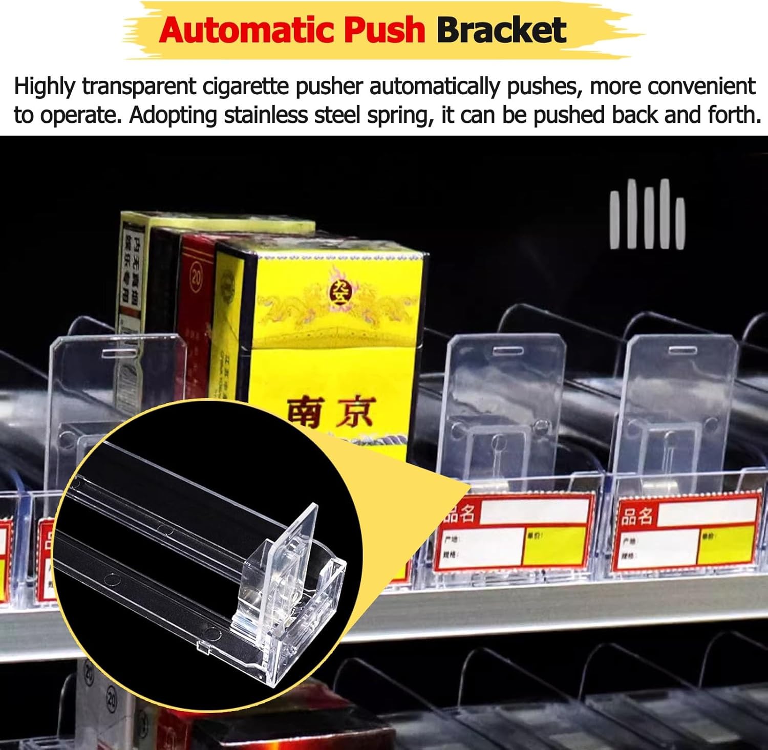 Retail Shelving Pusher:Are you tired of dealing with disorganized cigarettes in your retail space? Our retail cigarette display racks are designed to streamline your product presentation, making them perfect for convenience stores, department stores, and tobacco shops. **Product Specifications:** - **Material:** Durable Acrylic - **2 Tiers:** Length options of 33/45/63/69/75 cm (13/17.7/24.8/27.2/29.5 inches), Width: 15 cm (5.9 inches), Height: 17 cm (6.7 inches) - **3 Tiers:** Length options of 33/45/63/69/75 cm (13/17.7/24.8/27.2/29.5 inches), Width: 15 cm (5.9 inches), Height: 31 cm (12.2 inches) - **4 Tiers:** Length options of 33/45/63/69/75 cm (13/17.7/24.8/27.2/29.5 inches), Width: 15 cm (5.9 inches), Height: 45 cm (17.7 inches) - **5 Tiers:** Length options of 39/45/63/69/75 cm (15.4/17.7/24.8/27.2/29.5 inches), Width: 15 cm (5.9 inches), Height: 59 cm (23.2 inches) **Key Features:** - Constructed from high-toughness acrylic that resists breaking and deformation. - Transparent design allows for easy visibility of items, helping you quickly identify stock levels and reduce the risk of running out. - The automatic push feature simplifies the display of cigarette boxes, enhancing accessibility for customers. - Ideal for use in supermarkets, convenience stores, bars, and game rooms. **Package Includes:** - 1 × Cigarette Display Rack **Important Notes:** - Please allow for slight measurement differences due to manual sizing. - Actual product colors may vary from images based on display settings and lighting conditions. Elevate your retail experience with our organized and visually appealing cigarette display racks, ensuring your products are always presented at their best.