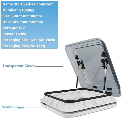 Transform your RV or caravan adventures with our premium Roof Window Skylight, expertly crafted to enhance ventilation and flood your space with natural light. Ideal for outdoor enthusiasts and professional converters, this skylight combines robust construction with intelligent design, making it an invaluable addition to any recreational vehicle. Key Features: - **Reflective Sunshade and Fine-Mesh Screen**: Enjoy added convenience and protection against bugs while allowing fresh air to circulate. - **Dual Hydraulic Support Rods**: Engineered for enhanced reliability and safety, ensuring smooth operation. - **Dual-Layer Acrylic Glass**: Offers superior impact resistance and long-lasting durability, suitable for all environments. - **Dual-Color LED Lighting**: Set the mood with adjustable lighting to create an inviting atmosphere, day or night. - **All-Weather Tight Seal**: Constructed with a strong aluminum alloy frame that resists corrosion and maintains form over time. Applications: Designed to fit a wide variety of vehicles, including caravans, camper vans, travel trailers, motorhomes, converted buses, and specialty commercial vehicles. Installation Note: This skylight requires a cutout size of 500x500mm or 700x700mm with rounded corners (R70). Always double-check measurements before installation. Professional installation is highly recommended for best results. Specifications: - **Opening Angle**: 70° - **Power**: 12V LED, 10.5W - **Frame Material**: Aluminum Alloy and ABS - **Glass**: Double-Layer Acrylic - **Suitable Wall Thickness**: 20–65mm Elevate your journey with this high-performance skylight, designed to maximize comfort, convenience, and durability, whether you're cruising down the highway or parked in a serene natural setting.