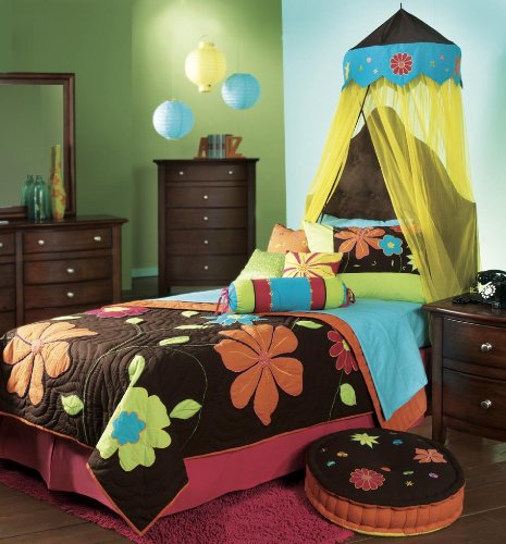 Top cap is Brown cotton fabric with embroidered patched on Turquoise Valance with yellow netting drop. 22" Round on Top with 96 inches Netting Drop