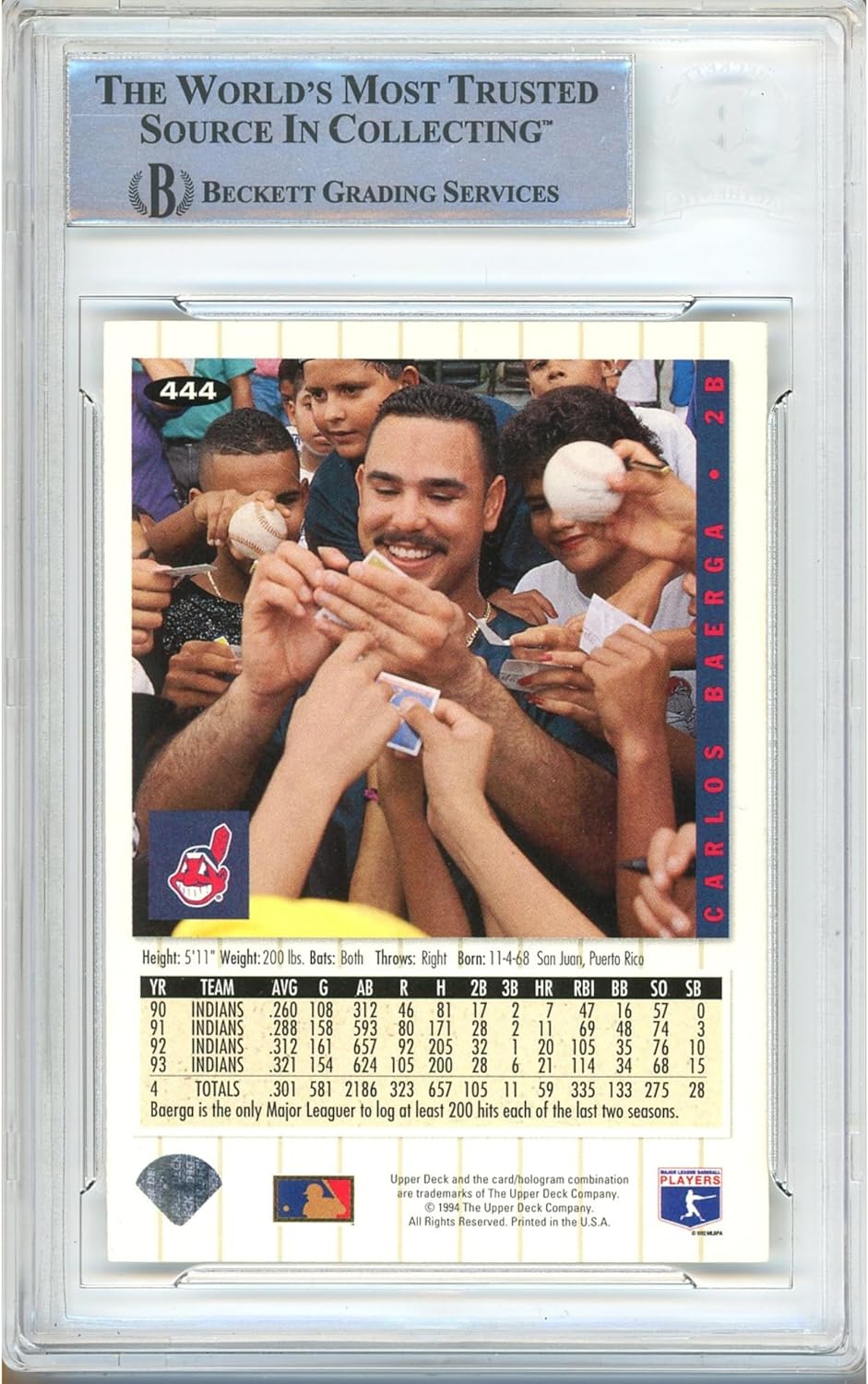 Add a classic Cleveland baseball collectible to your card collection with this Carlos Baerga Signed and Autographed 1994 Upper Deck Collectors Choice card, professionally protected as a Baseball Trading Card Slabbed by Beckett Authentication Services (BAS). Featuring the longtime MLB second baseman for the Cleveland franchise, this officially licensed sports card is a strong fit for Indians memorabilia and baseball memorabilia collectors. This autograph is Beckett BAS authenticated and preserved in an encapsulated sealed slab protective holder for long-term storage and display. The authentication number shown in photos and verifiable in the Beckett database provides added confidence, and the included BAS COA is provided through the Beckett BAS slab itself. For modern team searches, the Cleveland Indians franchise is now known as the Cleveland Guardians, making this a great crossover piece for both Indians and Guardians fans. Display it in a display case or showcase it in a man cave or fan cave as a certified authentic sports memorabilia centerpiece.