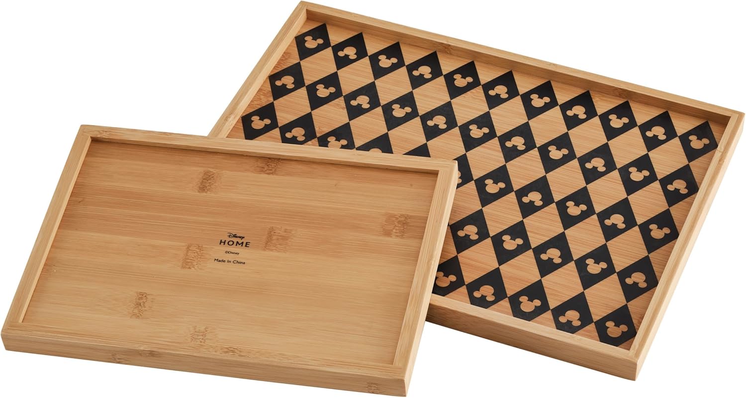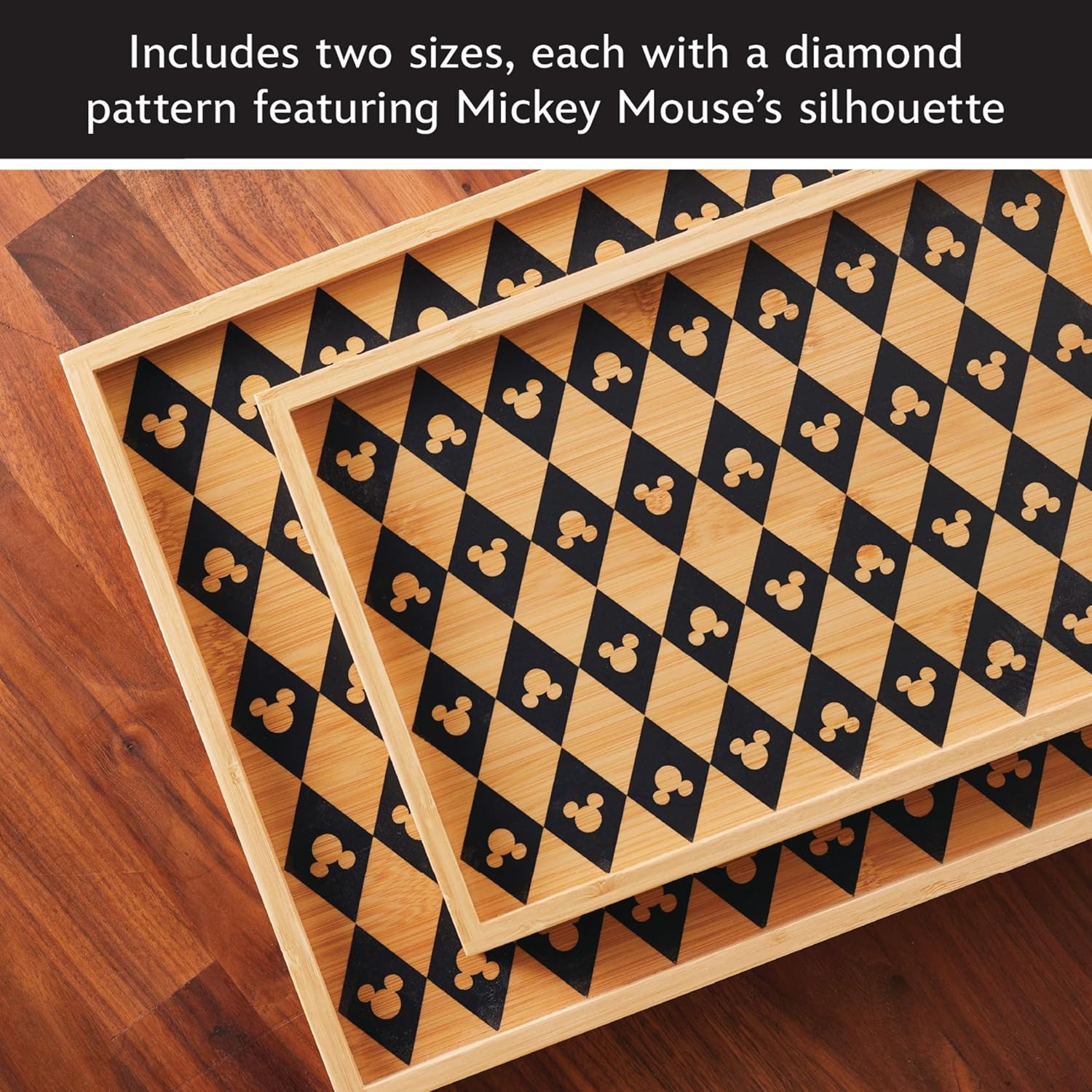 Bring the timeless magic of Disney Mickey Mouse to your kitchen with this 2-piece serving tray set from Disney Home, a line of kitchenware inspired by Disney's early-era black-and-white animated masterpieces. Made of durable but lightweight bamboo, these trays are sturdy and easy to carry, making them great for breakfast in bed, dinner with a movie, carrying snacks, or curating a Disney-inspired coffee station or other decor moment. The serving trays - one large measuring approximately 10 by 14 inches and one small measuring approximately 7.5 by 10.5 inches - feature Mickey’s iconic silhouette in a silk-screen-printed diamond pattern, helping you show off your playful side and love for the world’s most famous mouse while serving your own magic. The Monochrome collection combines classic kitchenware designs and contemporary functionality with trusted culinary performance and the nostalgic charm of classic Disney.