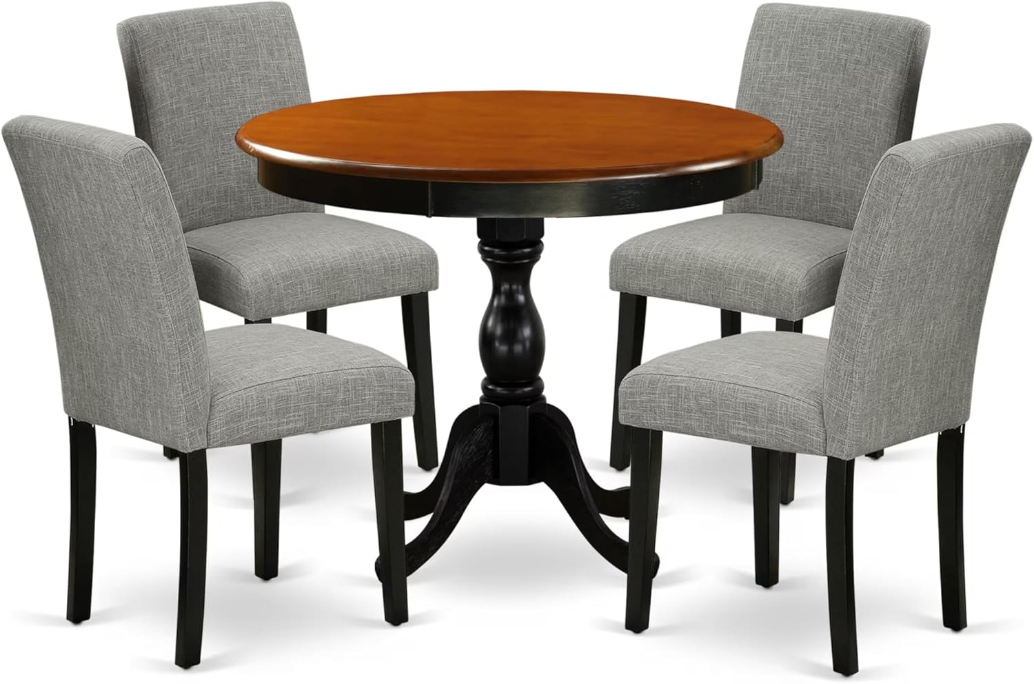 EAST WEST FURNITURE - AMAB3-MAH-18 - 3-PIECE DINING TABLE SETThe 3-piece dining set is an exquisite addition to any home, comprising a dining room table and two matching kitchen chairs. The wooden table is crafted in a classical style, with a mahogany hue that perfectly complements the Coffee linen fabric mid-century dining chairs, elevating its overall aesthetic appeal. These chairs exude elegance and sophistication, with a modern design that blends seamlessly with any decor. The dining chair features a contemporary high chair back that melds beautifully with the linen fabric seat, creating a sophisticated appearance. The spacious tabletop is fashioned from premium-quality rubber wood material, guaranteeing durability and long-lasting use. This contemporary, budget-friendly, durable, and comfortable wooden dining table set furniture is an outstanding option for anyone seeking an exceptional dining experience with loved ones.PRODUCT FEATURES:Frame Material: Asain WoodFabric Type: Linen FabricLinen Fabric Color: CoffeeColor: MahoganyChair Back Style: High BackDimension of Table: Length: 36; Width: 36; Height: 29.5.Chair Dimension: Length: 22; Width: 17.20; Height: 35.20.Include in Package: 2 Padded Chair and A Modern Dining Table.