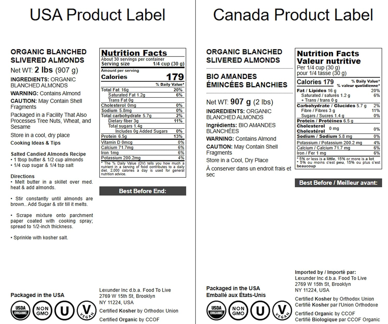 — Non-GMO, Kosher, Raw and Vegan — Organic Blanched Slivered Almonds have a high concentration of vitamin E, magnesium, potassium, and folic acid, which have beneficial effects for you — These Organic Almonds are very low in cholesterol and sodium but high in riboflavin and manganese How to Enjoy Organic Blanched Slivered Almonds Organic Blanched Slivered Almonds are tasty and rich in nutrients, such as vitamin E, iron, and calcium. Because these almonds are already blanched, they are easy to include in your daily meals. Organic Slivered Almonds go through a machine process. It heats up the nuts to prevent them from shattering and then cuts them into thin slivers. You can’t repeat this process at home because a food processor can only crush nuts, not cut them into thin long pieces. Note that blanched and unblanched almonds are very similar in nutritional value. But blanching removes skins, which might make the nuts slightly vary in taste and present with a little bitterness. Ideas for Cooking with Organic Blanched Slivered Almonds You can use organic slivered almonds in salads and sprinkle them onto oatmeal. Add them to trail mixes or granola. You can also use them when making a variety of desserts and candies. Raw organic slivered almonds are delicious, but they taste even better when toasted. The best way to do this is to pre-heat an oven to 350F. Place some waxed paper onto a thin baking sheet and spread almond slivers in a single layer. Put them into the oven and leave for 3-4 minutes. Then, please take out the sheet, shake it up to stir the almonds, and place back into the oven for about 1-2 minutes more. You can consider them done once the nuts are as brown as you want them to be._Nutrition Facts 1 servings per container Serving size1 oz (28 g) Amount Per Serving Calories167 % Daily Value* Total Fat 15g 19% Saturated Fat 1g 6% Trans Fat 0.01g Cholesterol 0mg 0% Sodium 5mg 0% Total carbohydrate 5g 2% Dietary fiber 3g 10% Total sugars 1g Includes 0g Added Sugars 0% Protein 6g 12% Vitamin D 0mcg 0% Сalcium 67mg 5% Iron 1mg 5% Potassium 187mg 4% Vitamin E 7mg 45% Copper 0.3mg 32% Manganese 1mg 23% Magnesium 76mg 18% Riboflavin 0.2mg 16% Phosphorus 136mg 11% Zinc 1mg 8% Niacin 1mg 6% Thiamin 0.1mg 5% Folate 14mcg 3% Selenium 1mcg 2% Pantothenic Acid 0.1mg 2% Vitamin B6 0.03mg 2% * The % Daily Value (DV) tells you how much a nutrient in a serving of food contributes to a daily diet. 2,000 calories a day is used for general nutrition advice. Ingredients: ORGANIC BLANCHED ALMONDS WARNING: Contains Almond CAUTION: May Contain Shell Fragments Storage Time: Up to 1.5 years Country of Origin: Italy Packaged in: the USA Store in: Cool, Dry Place Allergy Info: Packaged in a Facility That Also Processes Tree Nuts, Wheat, and Sesame Kosher Non-GMO Organic Vegan