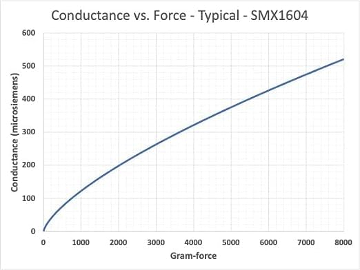 This array of 256 force-sensing cells, 16 rows and 16 columns, has an active area of 4x4 inches. (See drawing for complete dimensions.) It can be used as a multitouch user input device or for any number of other pressure- or force-mapping applications. ShuntMode construction provides a wide dynamic range, from approximately 0.1 psi to over 500 psi. The resistance and conductance graphs show typical characteristics for each sensor in the matrix. The value measured will also depend on sensor coverage. NOTE: The ShuntMode MatrixArray ships with header pins, which must be soldered to the PCB by the user. The pads on the PCB have a 0.100" pitch, allowing for use of a wide range of user-supplied headers and connectors.